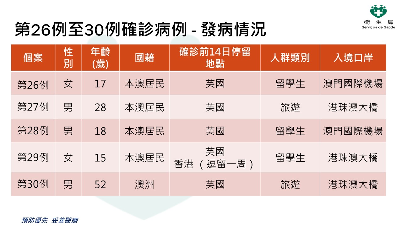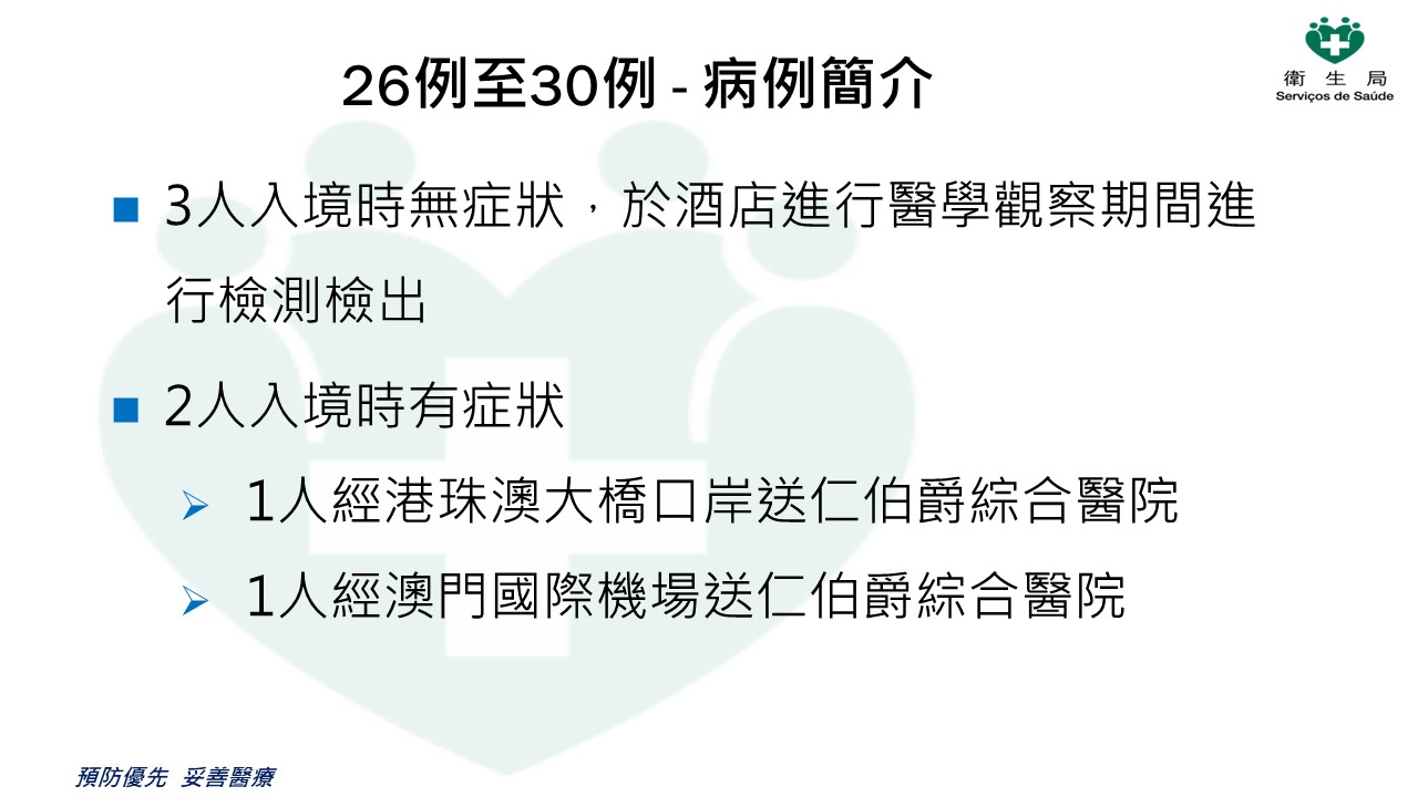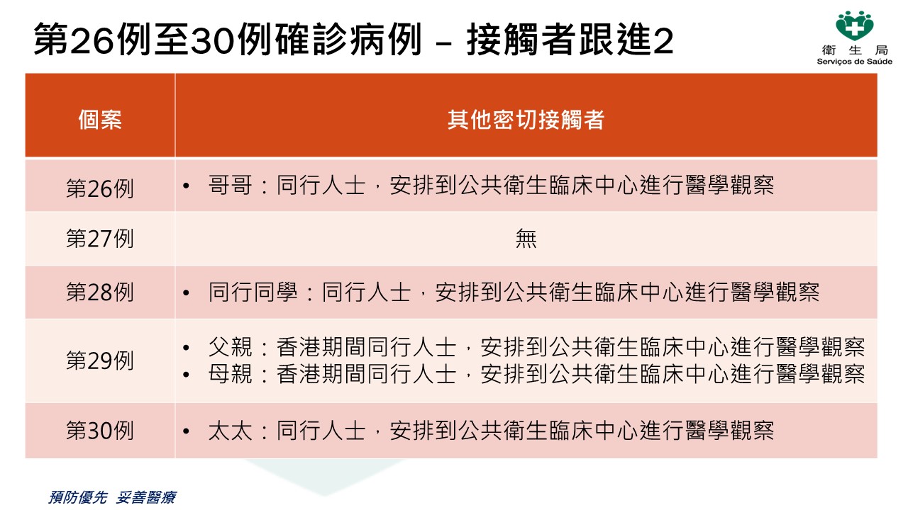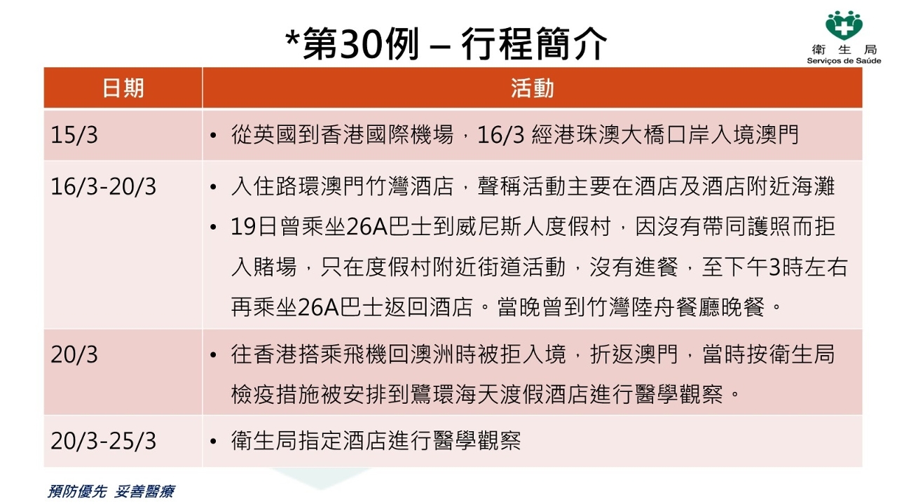 應變協調中心表示,第30例患者為澳洲籍旅客,本月16至20日入住路環澳門竹灣酒店,期間主要在酒店及海灘逗留,只於19日曾離開酒店,乘坐26A巴士。經評估後,由於他主要在戶外較開揚的地方逗留,且全程有佩戴口罩,相信傳播病疫的風險較低。