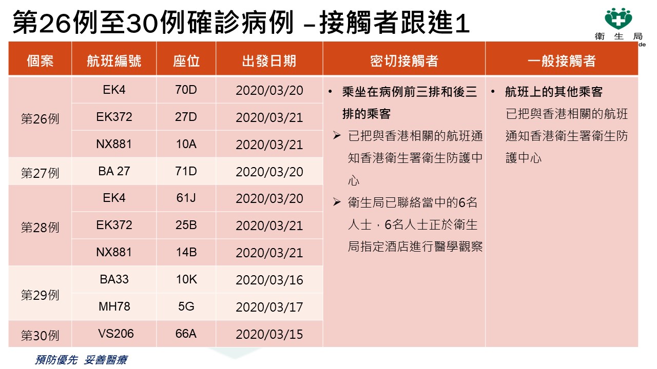 另外,應變協調中心表示,第26至30例確診患者中,有6位密切接觸者是在飛機上與確診患者有接觸,另有5位則在其他地方接觸。