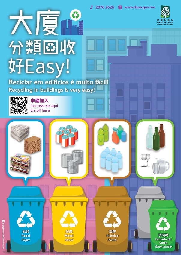另外,環保局已開展“大廈分類回收好Easy”活動,推動於大廈內設分類回收箱,創設更便利的回收條件,目前已有超過170屋苑、約550棟大廈參與計劃,參與大廈數量正持續增加,歡迎報名參與。市民亦可透過環保局網頁(http://www.dspa.gov.mo)或致電“環保熱線”(2876 2626)查閱詳情。