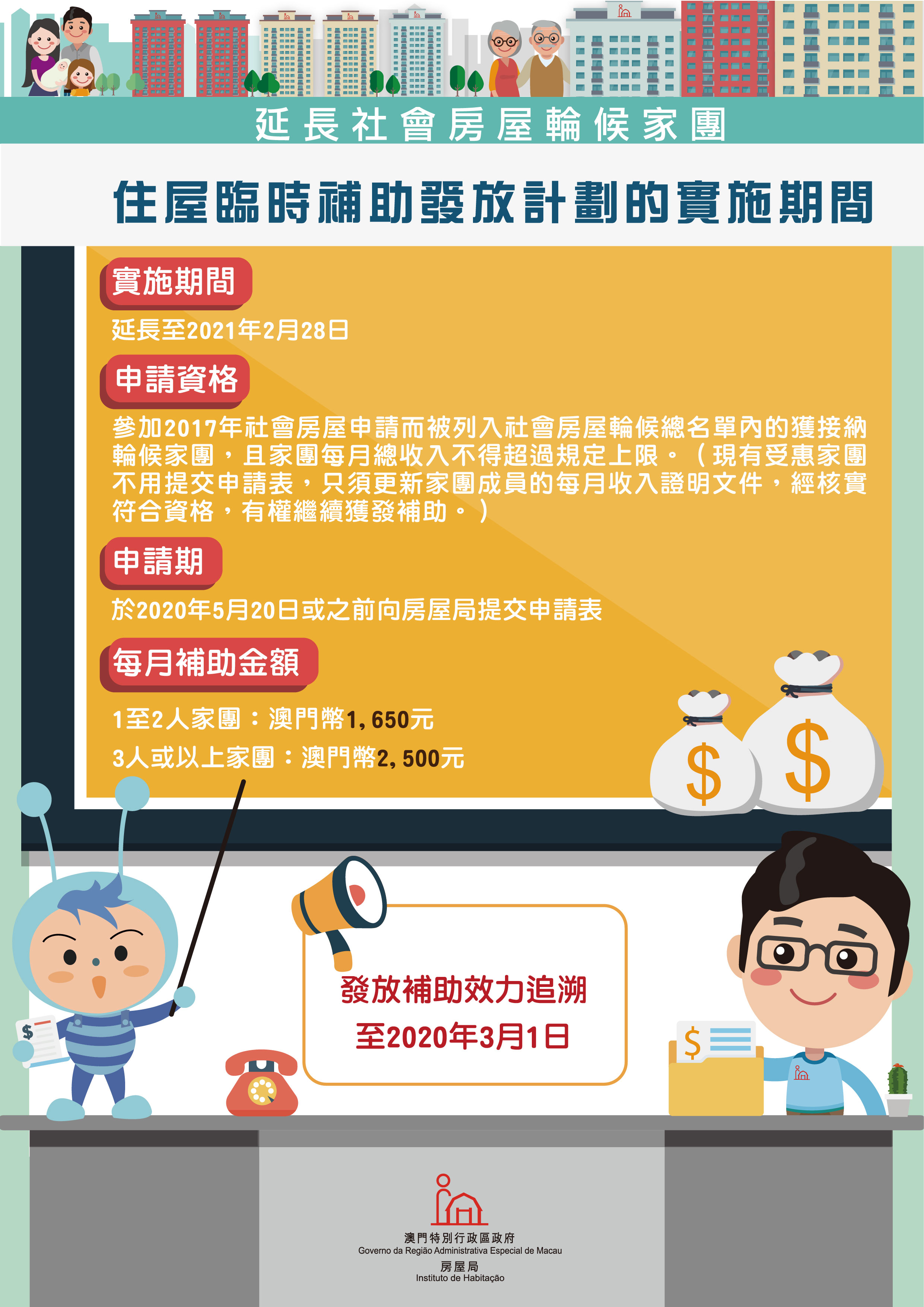 有關計劃於二零二零年三月一日至二零二一年二月二十八日期間實施,住屋補助最多發放十二期,一至兩人家團每月補助金額為澳門元1,650元,三人或以上家團每月補助金額為澳門元2,500元。申請人須於二零二零年五月二十日或之前提出申請。