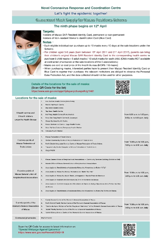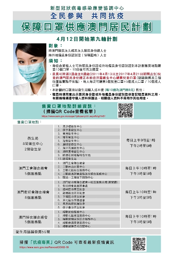 第九輪計劃的實施方式、售賣點及售賣時間等與第八輪相同,對象為本澳永久及非永久居民、持外地僱員身份認別證(俗稱藍咭)人士;衛生局轄下衛生中心及衛生站、衛生局協議藥房、本澳三個社團(工聯、街總、婦聯)繼續提供售賣口罩服務,即全澳共有84個售賣點,詳情見附圖。