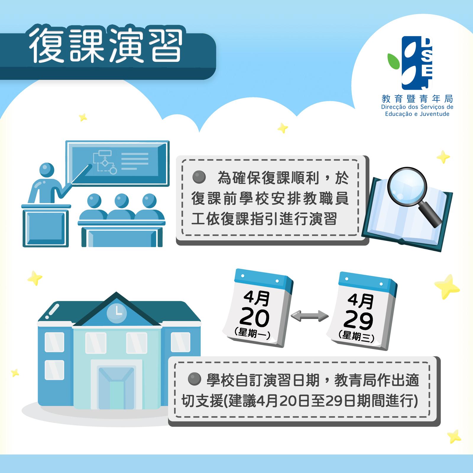 為做好復課的準備,教青局已為學校制定復課指引,內容涵蓋衛生防疫措施、教與學、評核與升留級等方面。為確保復課順利進行,教青局會提供支援,協助學校於復課前,依據復課指引進行模擬演習,讓教職員工都能掌握復課後的各項工作細節和應對預案。這份指引亦會隨即上網,希望學校按指引做好復課前的準備工作,以便復課後的工作開展。