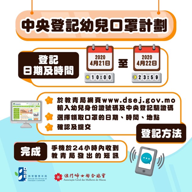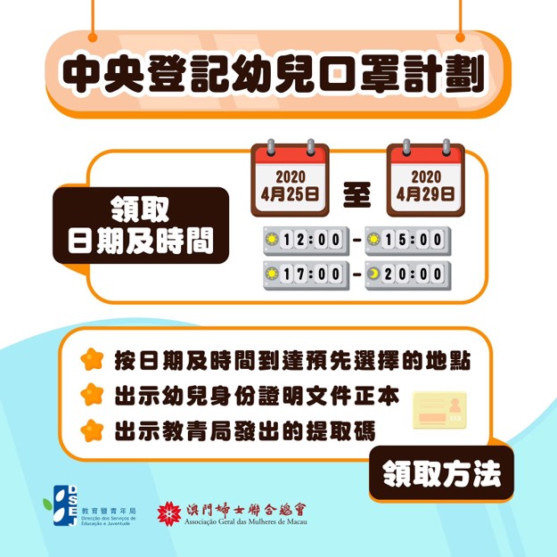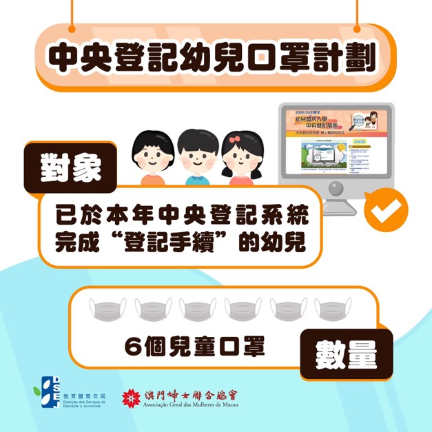 為保障幼兒安全,教青局推出中央登記幼兒口罩計劃,向中央登記約6,400名幼兒派發6個兒童口罩。