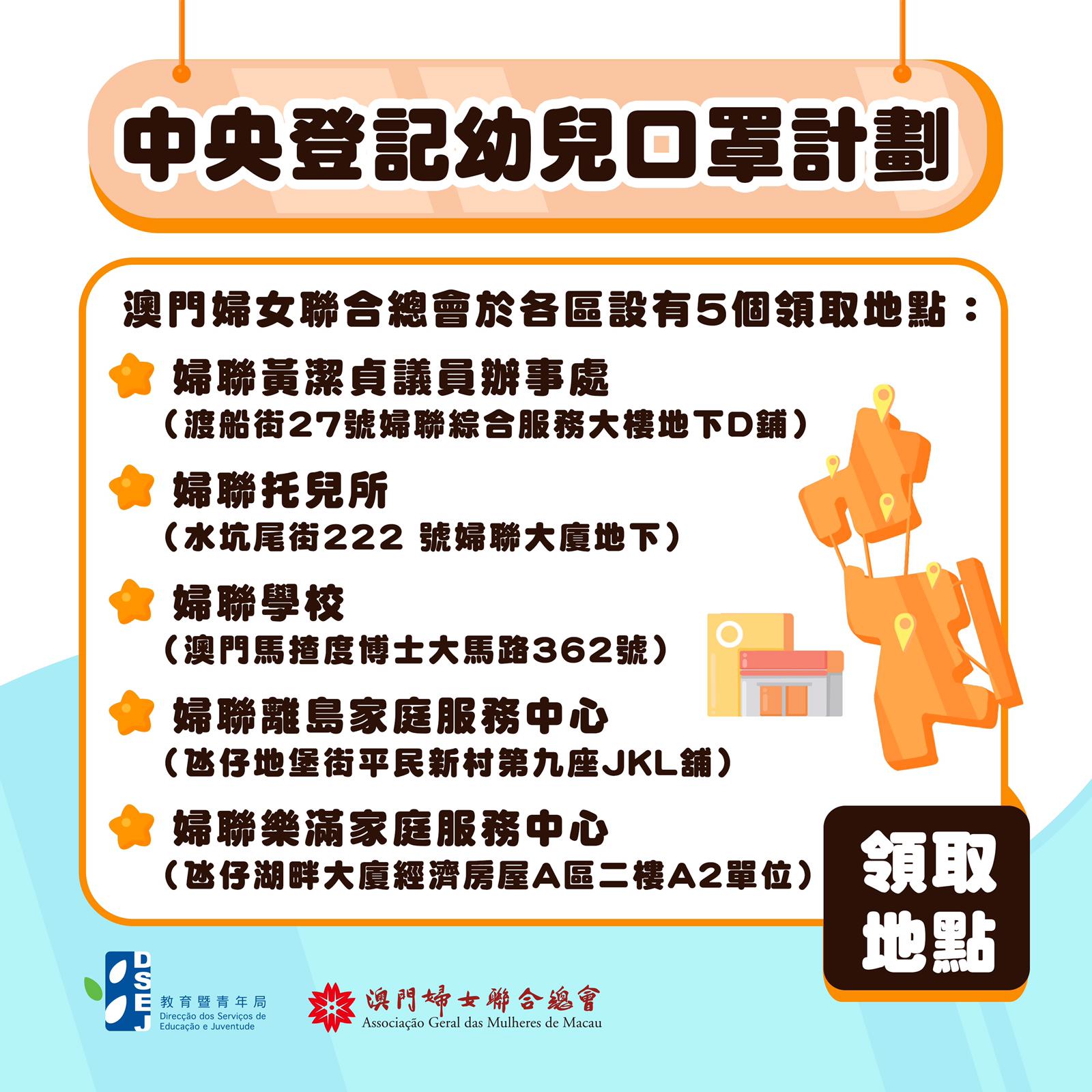 澳門婦女聯合總會於各區的5個領取地點如下:
