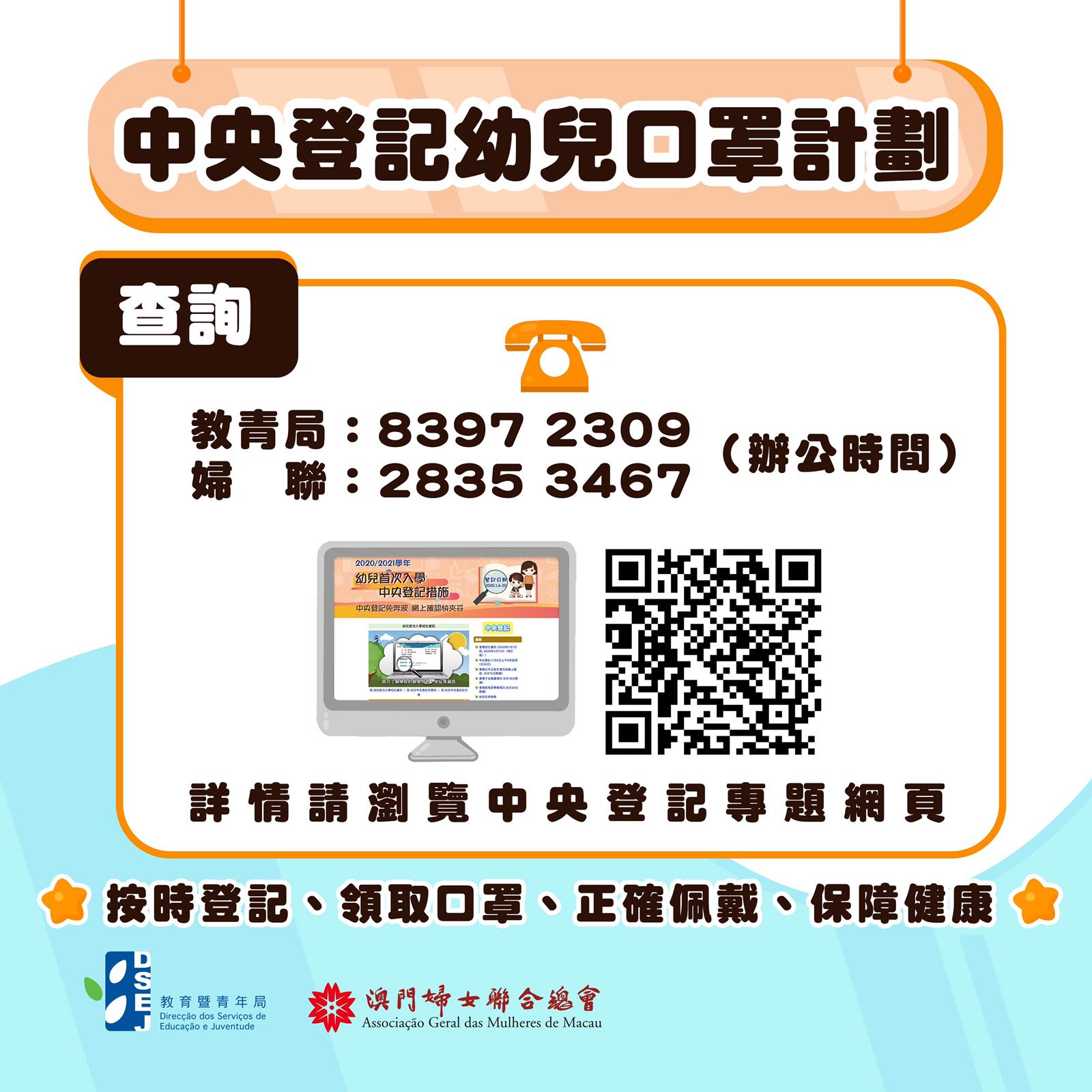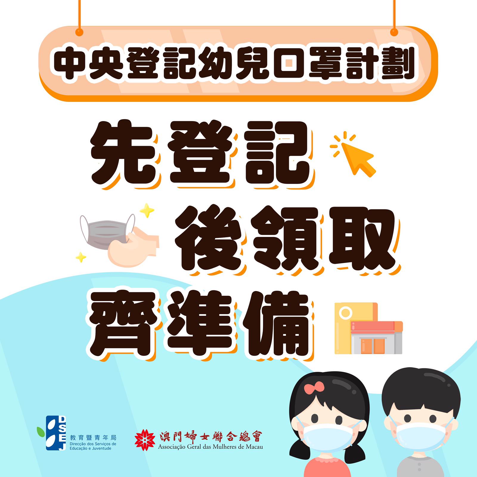 為關顧首次入學幼兒於5月2日起入學面談的需要及配合招生工作的開展,在衛生局的協助下,教青局將向中央登記約6,400名幼兒派發6個兒童口罩,並與澳門婦女聯合總會合作,透過其位於各區的5個領取點讓入學面談幼兒家長領取口罩。