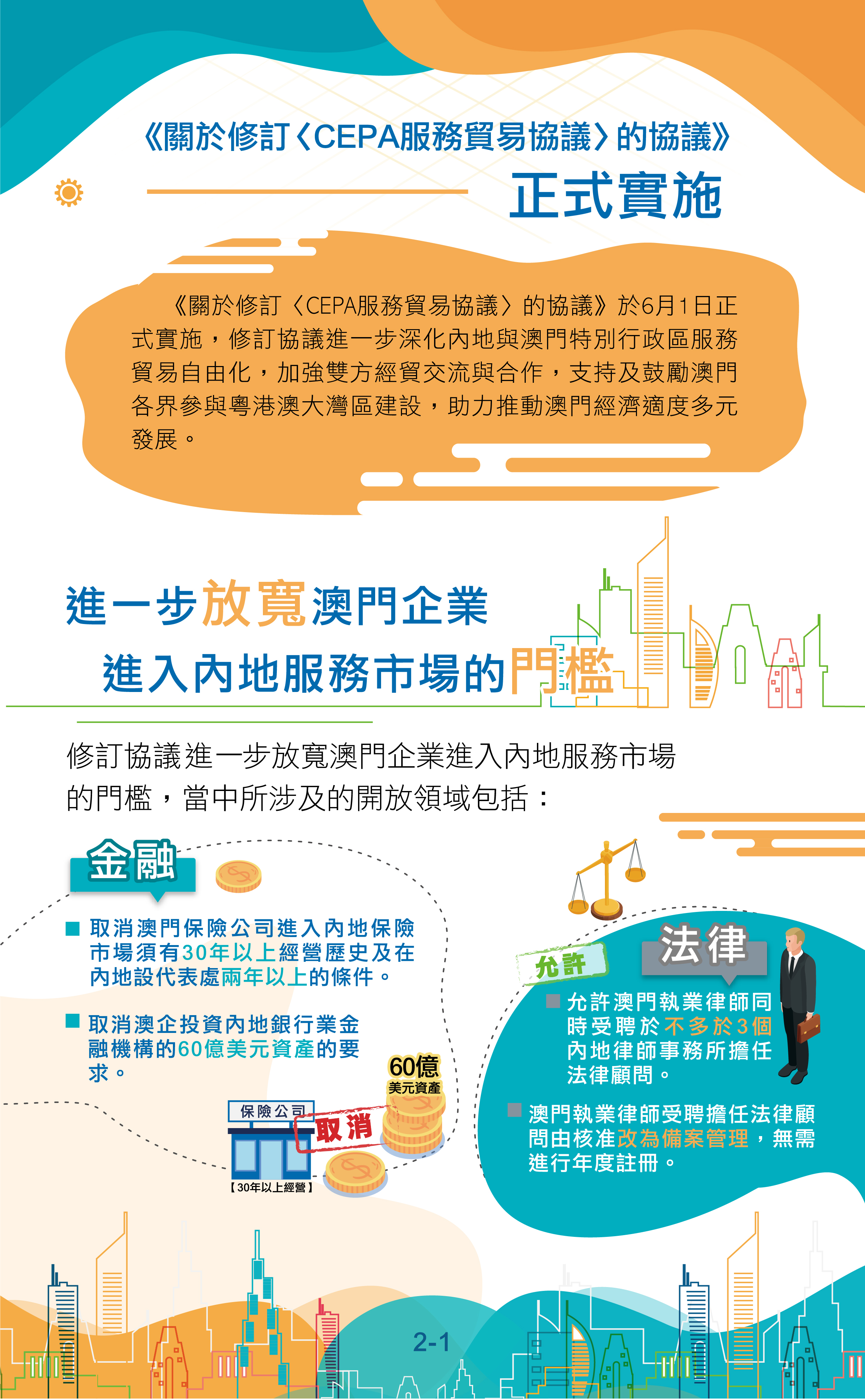《關於修訂〈CEPA服務貿易協議〉的協議》為澳門服務業界到內地發展注入新動力、創造新條件、帶來新契機。期望澳門服務業企業及專業人士抓住CEPA帶來的商機,發揮自身優勢,提升競爭力,加強與內地互利合作,以拓展更廣濶的發展空間。