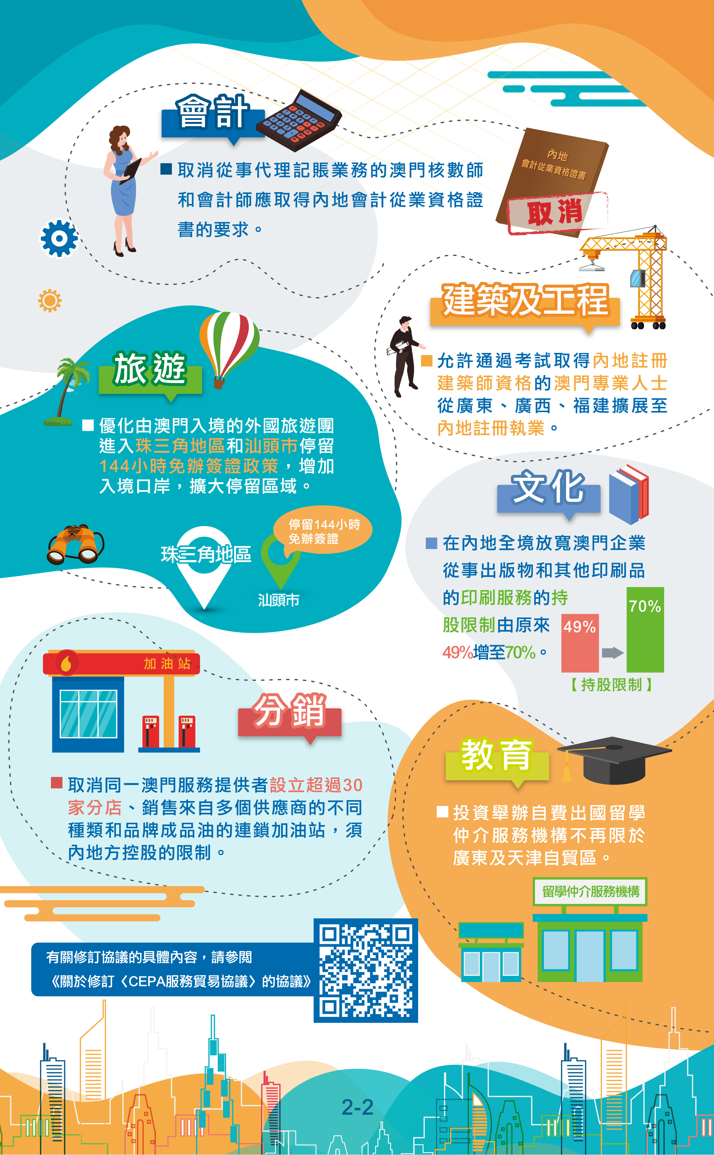 修訂協議進一步放寬澳門企業進入內地服務市場的門檻,當中所涉及的開放領域包括金融、法律、會計、建築及工程、文化、旅遊、分銷、教育等多個服務,在原有基礎上增加開放措施,為澳門企業及專業人士到內地發展提供更便利條件。