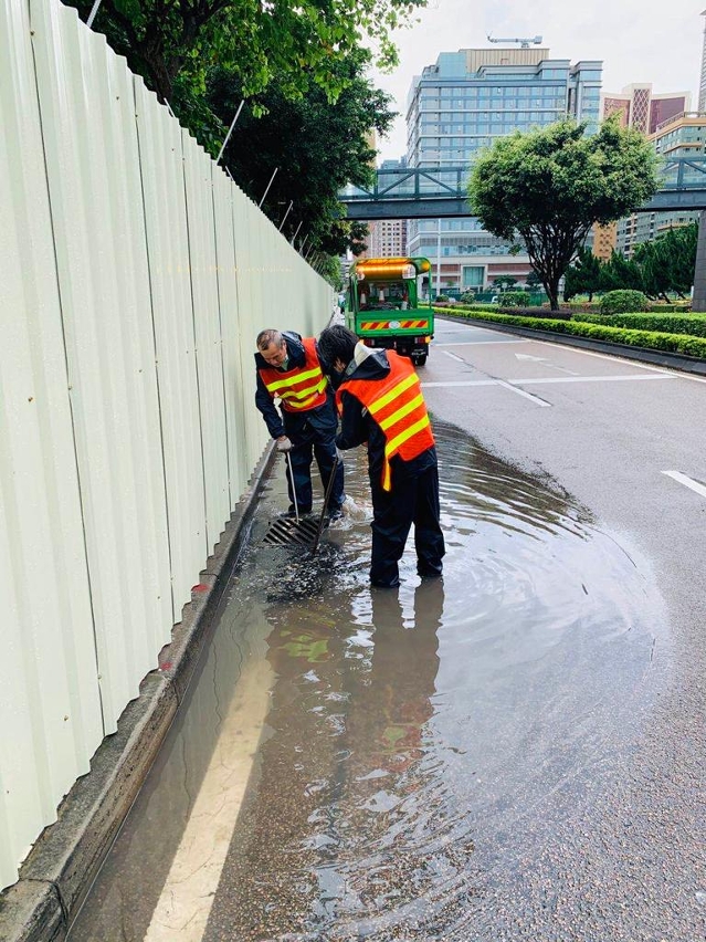 因應強降雨時間持續,渠道積聚大量雨水,新橋、台山、內港及氹仔舊城區相繼出現水浸現象,其中台山超過180毫米降雨。而因海潮高度達2.1米,減低了雨水渠的排洪能力。為此,市政署即時啟動暴雨應變機制,派員到各雨水泵房巡查,開啟水泵以排洪。同時,分別派員及要求外判清渠公司往低窪地區進行緊急清理路邊雨水井工作,清走積聚渠口垃圾,打開渠蓋加快排洪。