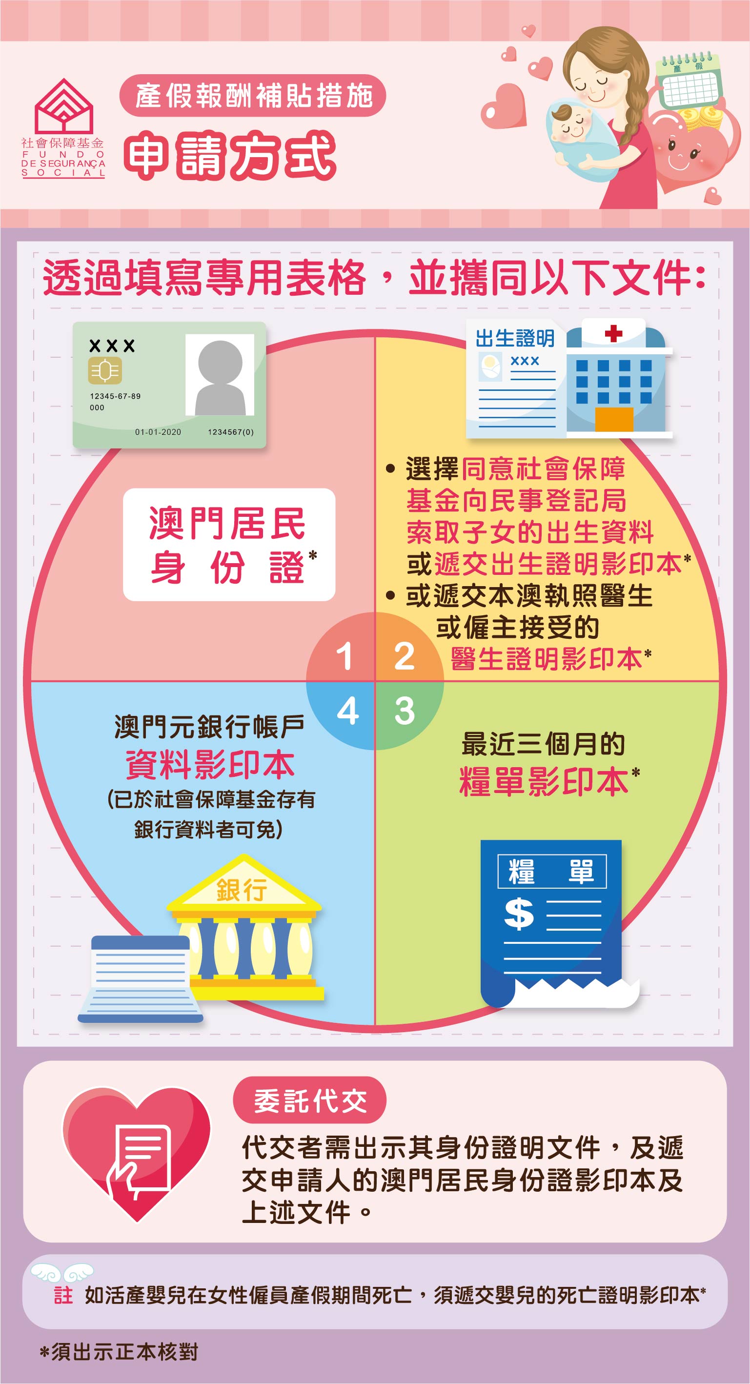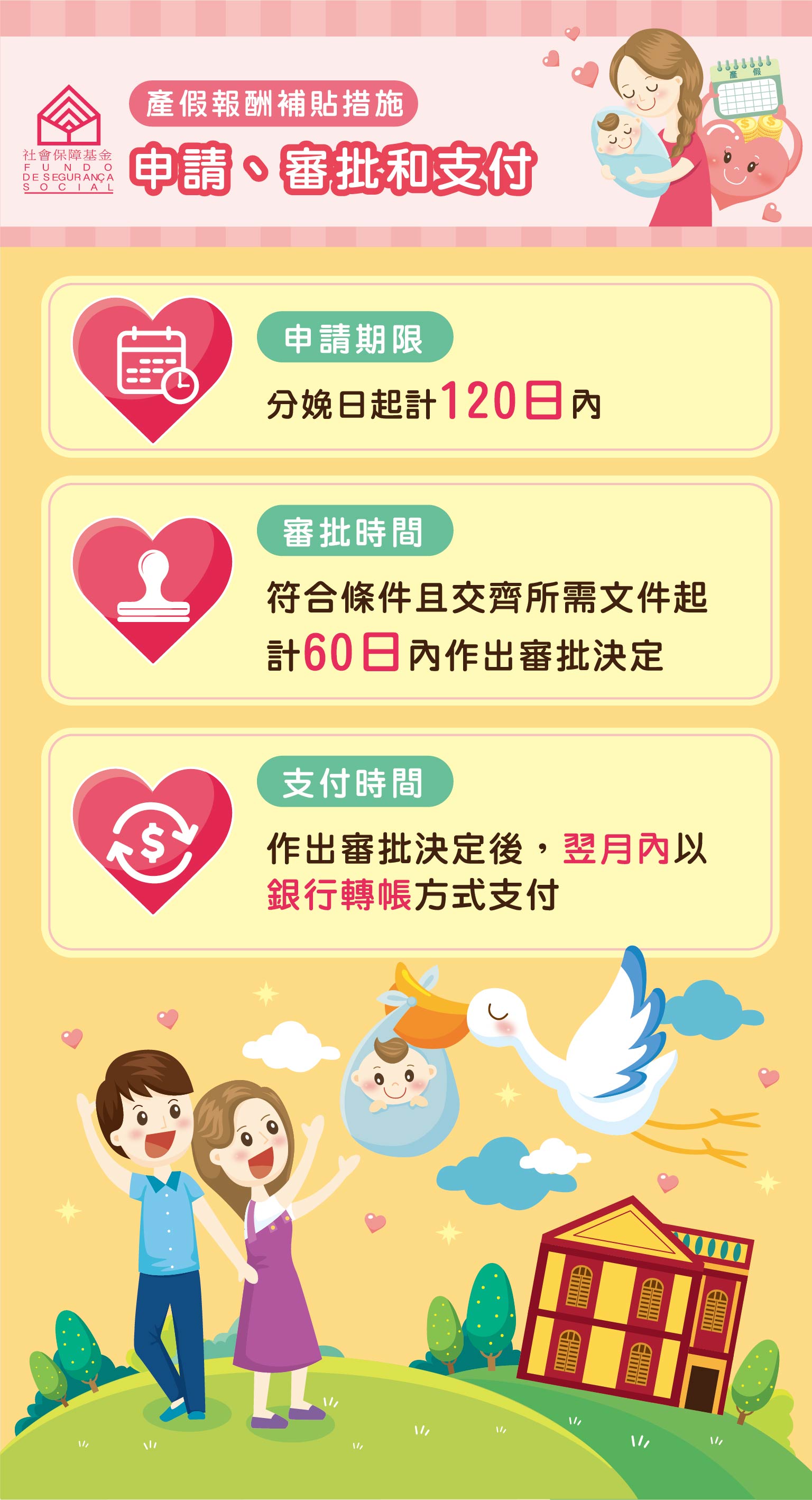 法規規定,在法律生效後分娩或出現法定可享有產假的情況,且發生有關事實時勞動關係已超過一年的本地女性僱員,應自有關事實發生之日起計120日內向社會保障基金申請產假報酬補貼,該基金則應自收齊申請所需文件之日起60日內作出決定,並在作出批准決定後的翌月內向有關僱員發放補貼。