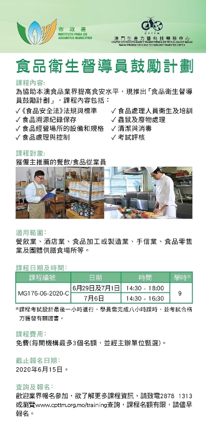 為協助本澳食品業界做好食品安全管理工作,市政署委託澳門生產力暨科技轉移中心開辦「食品衛生督導員課程」,六月份課程將於六月二十九日在澳門生產力暨科技轉移中心舉行,報名日期由即日起至六月十五日,鼓勵本澳食品業界參加。