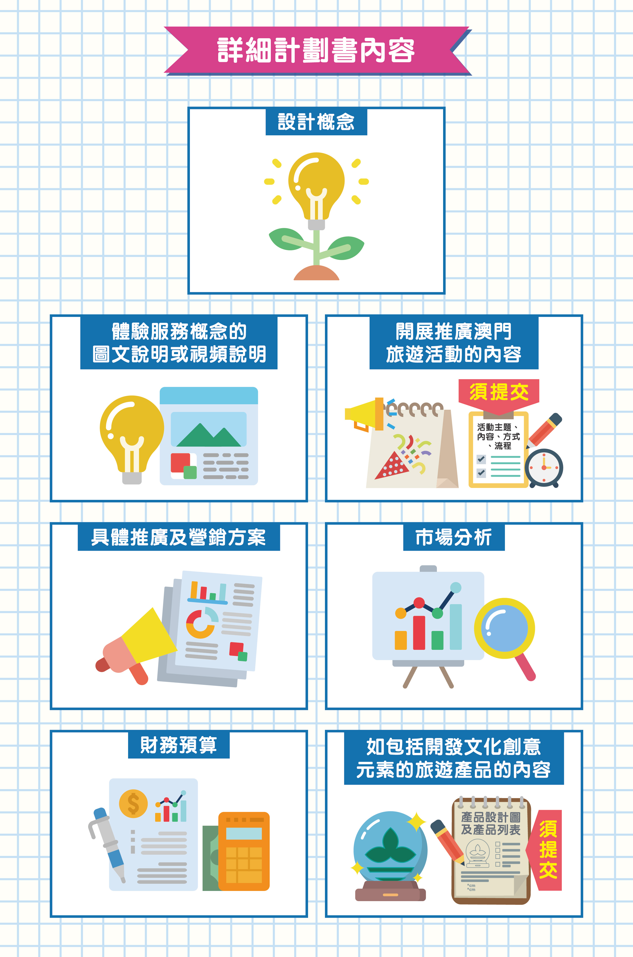 申請計劃書須包括符合該專項計劃目的的設計概念、體驗服務的圖文說明或視頻說明,系列活動的主題、內容、活動方式、預計的時間及地點、活動流程等資料,以及市場分析、推廣及營銷方案。如體驗項目包含開發文化旅遊產品,須提交產品設計圖等資料。