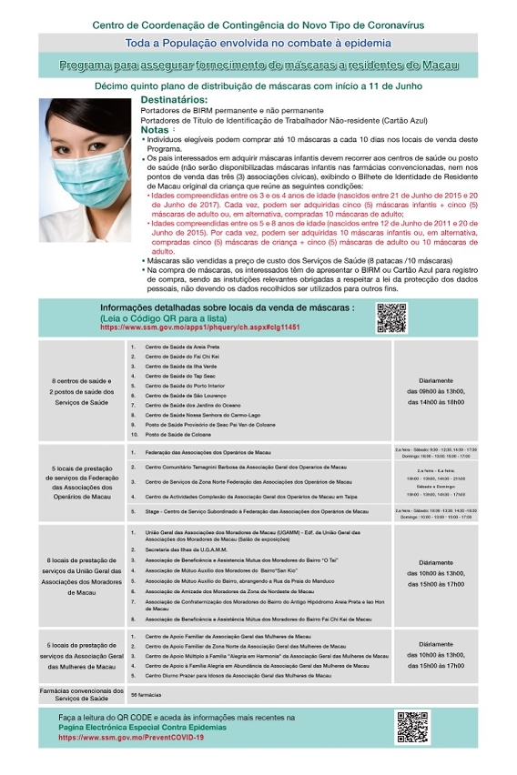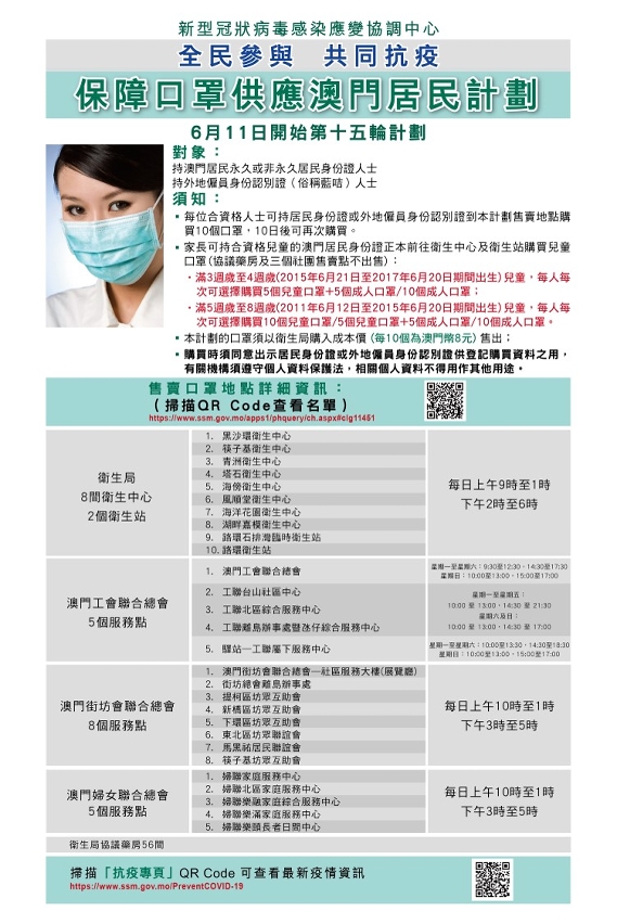 第15輪計劃的實施方式、售賣點與第14輪相同;售賣時間方面,工聯轄下5個售賣點稍有調整,其他售賣點則不變。而計劃的對象為本澳永久及非永久居民、持外地僱員身份認別證(俗稱藍咭)人士;衛生局轄下衛生中心及衛生站、衛生局協議藥房、本澳三個社團(工聯、街總、婦聯)繼續提供售賣口罩服務,即全澳共有84個售賣點。
