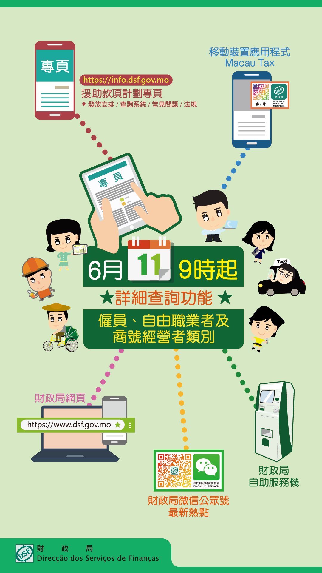 財政局在6月2日率先推出僱員援助款項簡易查詢系統,直至6月10日,超過358,220人次透過查詢系統了解自己是否符合資格收取援助款項。其後於6月11日,財政局開通連同自由職業者及商號經營者的詳細查詢系統,至昨(16)日有119,518人次透過該系統進行查詢。