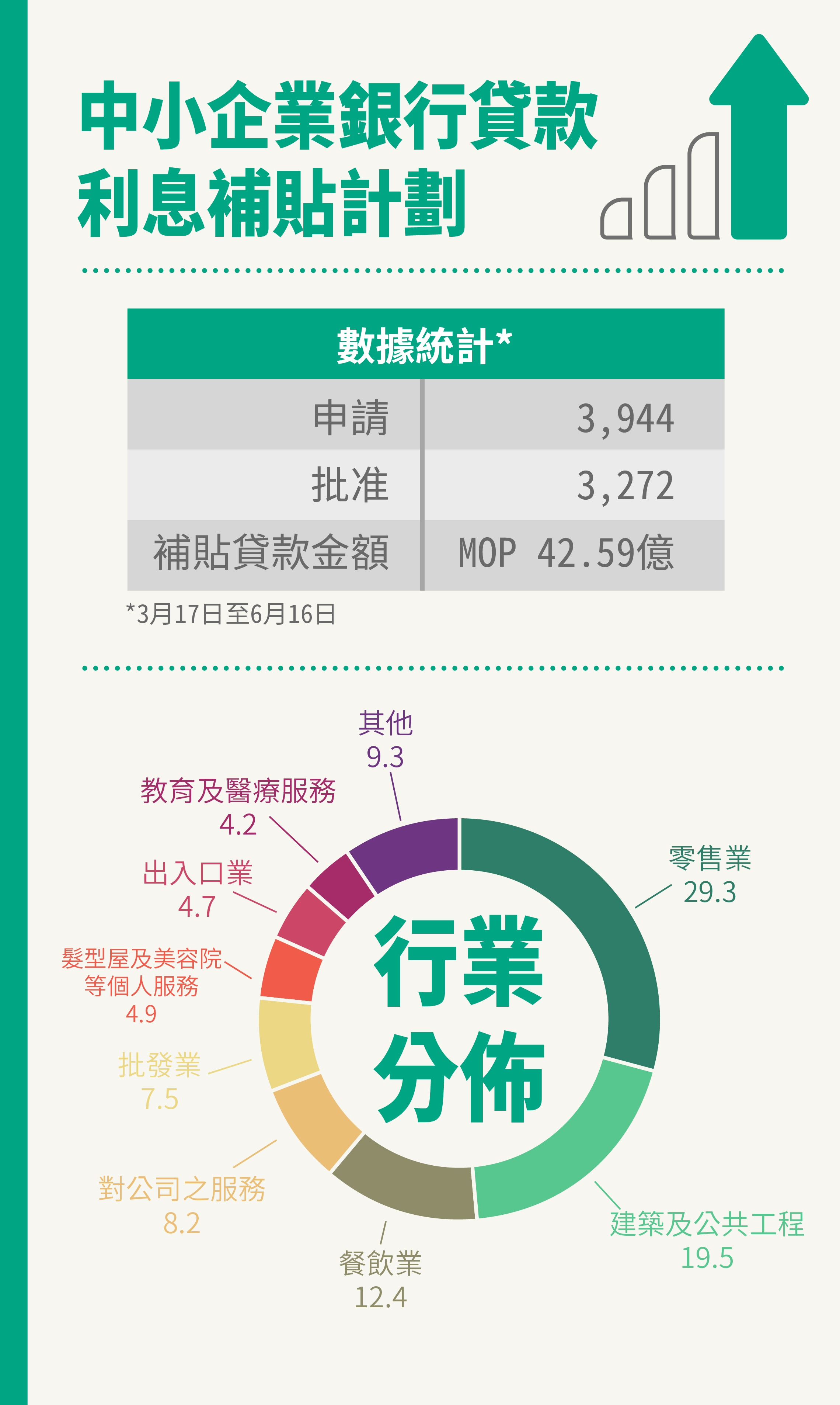特區政府為支援中小企業應對新冠肺炎疫情而推出的“中小企業銀行貸款利息補貼計劃”,自3月17日推出至6月16 日,已接收3,944宗申請,當中3,272宗已獲批准,佔總數八成。
