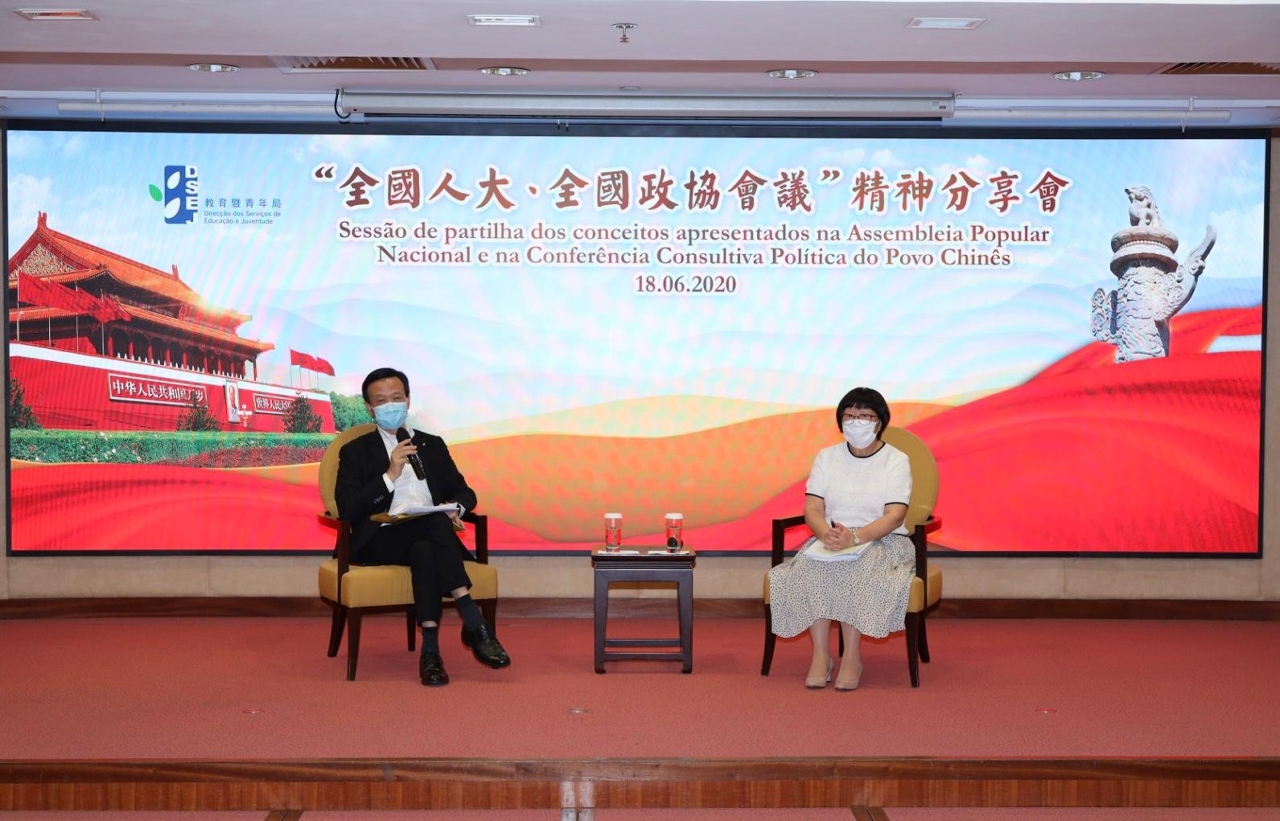 為讓澳門青年及學生更了解國家政策、維護國家安全的必要性,以及澳門未來的發展方向,教育暨青年局於2020年6月18日晚上6時30分至8時在教青局總部一樓仲尼堂舉辦“全國人大、全國政協會議”精神分享會,邀請了澳門人大代表團團長劉藝良及全國政協澳區委員吳培娟向青年學生講解“人大”和“政協”的性質與作用、國家的工作報告要點、脫貧攻堅戰的成效、新冠肺炎疫情的防控、“六保”任務和“六穩”工作、國家首部《民法典》的编纂,推進大灣區建設、以及維護國家安全的必要性等“兩會”的重點內容。是次的分享會吸引了近50個青年社團代表、27所中學學生會骨幹成員,以及教青局領導及主管人員到場出席,同時,教青局亦組織了過百名的青年學生在教青局轄下的青年中心收看網上直播。