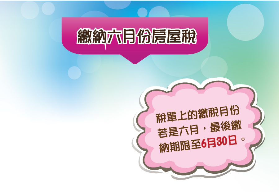 財政局提醒房屋稅納稅人,如收到之2019年度房屋稅徵稅憑單上所載之繳納月份為6月,最後之繳納期限至6月30日止,為免增加輪候時間或因逾期繳納而附加之過期利息和罰款,財政局呼籲倘仍未繳納上述房屋稅之納稅人,請儘快利用財政局提供的繳稅方式繳納房屋稅,亦可於辦公時間內,到指定銀行櫃位,或位於南灣財政局大樓、龍成大廈、政府綜合服務大樓及離島政府綜合服務中心收納處繳交,為便於繳納,納稅人憑澳門居民身份證於自助服務機,可列印稅單摘要,資料可供自動櫃員機及銀行提供電子交易繳納稅款,又或者於下列地點設置之財政局自助服務機補印稅單交稅。