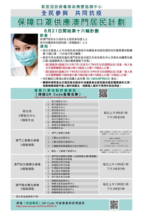 新型冠狀病毒感染應變協調中心今(19)日公佈,第16輪保障口罩供應澳門居民計劃於後(21)日開始。第16輪計劃的實施方式、售賣點與第15輪相同,其中,因應小學一至三年級復課,滿五週歲至八週歲的兒童,每人每次可選擇購買10個兒童口罩、或5個兒童口罩和5個成人口罩、或10個成人口罩。