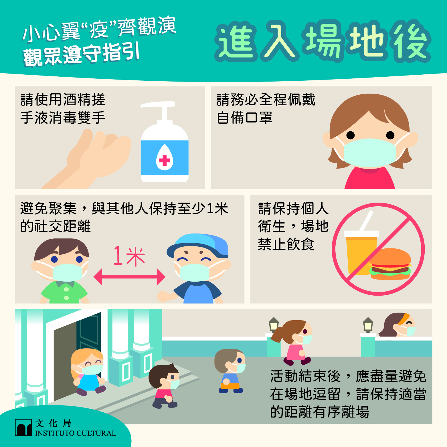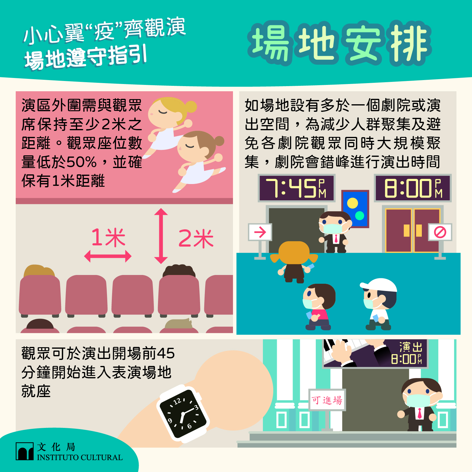 文化局一直以保障市民健康為首要考慮,經聽取衛生部門防疫意見後,制定了“文化局轄下表演場地租/借用單位防疫指引”及“文化局轄下表演場地公眾防疫指引”,所有表演者、工作人員及觀眾均須遵循指引,作出配合。為免人群聚集,表演場地將嚴格控制入場人數,觀眾座位數量將不超過總座位數量的一半,表演場地內的附屬設施如排練室、綵排室及休息室等亦設有容納人數上限。此外,如表演場地内設有多於一個劇院或演出空間,亦須錯峰進行演出。觀眾席與演區外圍亦須保持至少2米距離,所有表演場地將加強清潔消毒措施。