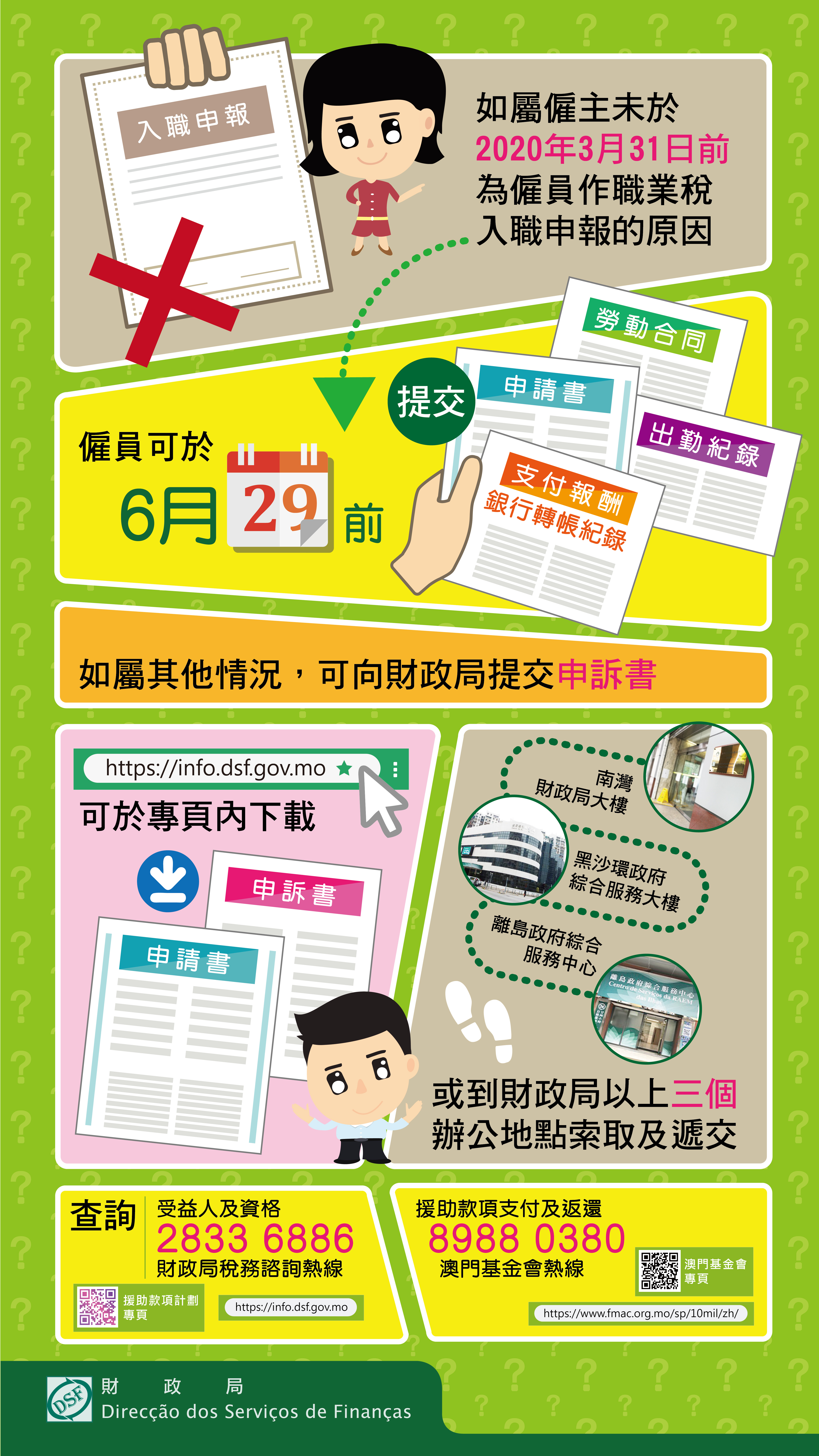 申請書及相關文件可交往財政局以下三個服務站點:(一) 南灣財政局大樓;(二) 黑沙環政府綜合服務大樓;(三) 離島政府綜合服務中心。