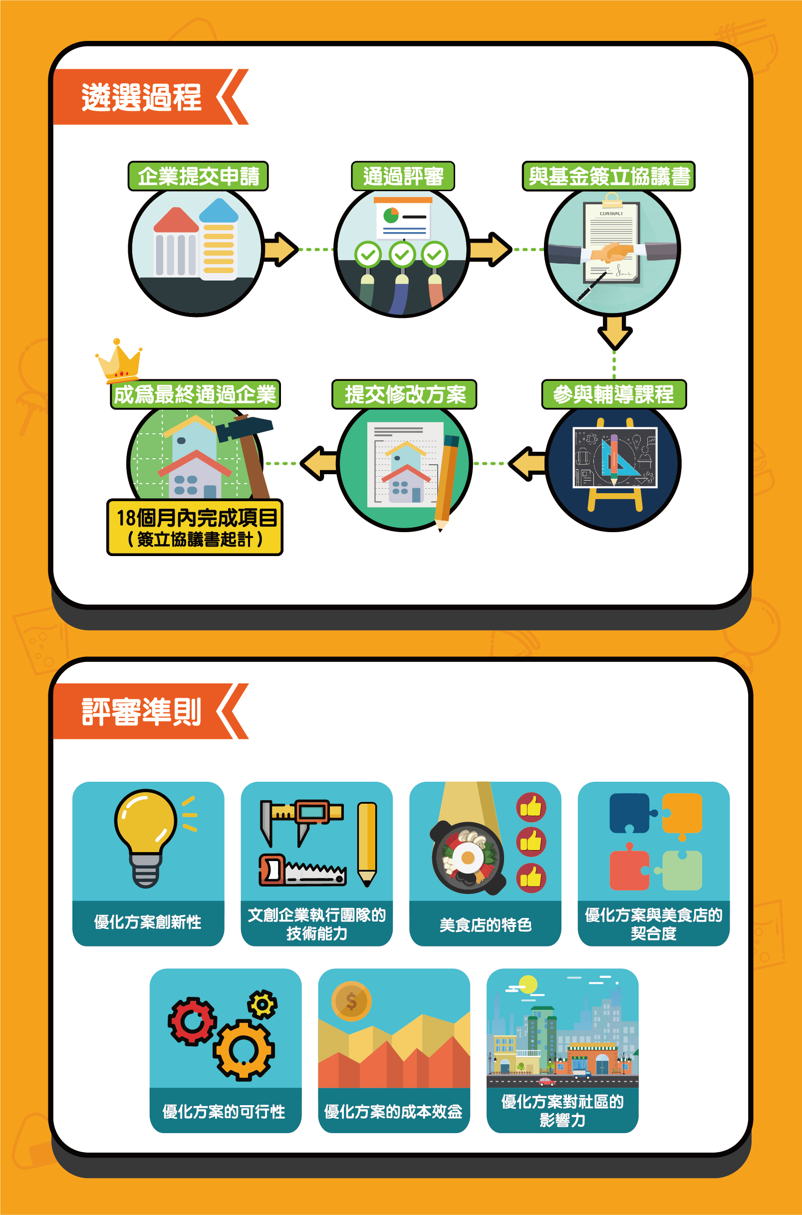 評審將根據申請項目的創新性、文創企業執行團隊的技術能力、美食店的特色,以及優化方案的可行性、與美食店的契合度、成本效益、對社區的影響力等7項指標作為評審準則。