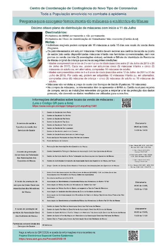 第十八輪計劃的實施方式、售賣點及時間與第十七輪相同。而計劃的對象為本澳永久及非永久居民、持外地僱員身份認別證(俗稱藍咭)人士;衛生局轄下衛生中心及衛生站、衛生局協議藥房、本澳三個社團(工聯、街總、婦聯)繼續提供售賣口罩服務,即全澳共有84個售賣點,詳情見附圖。