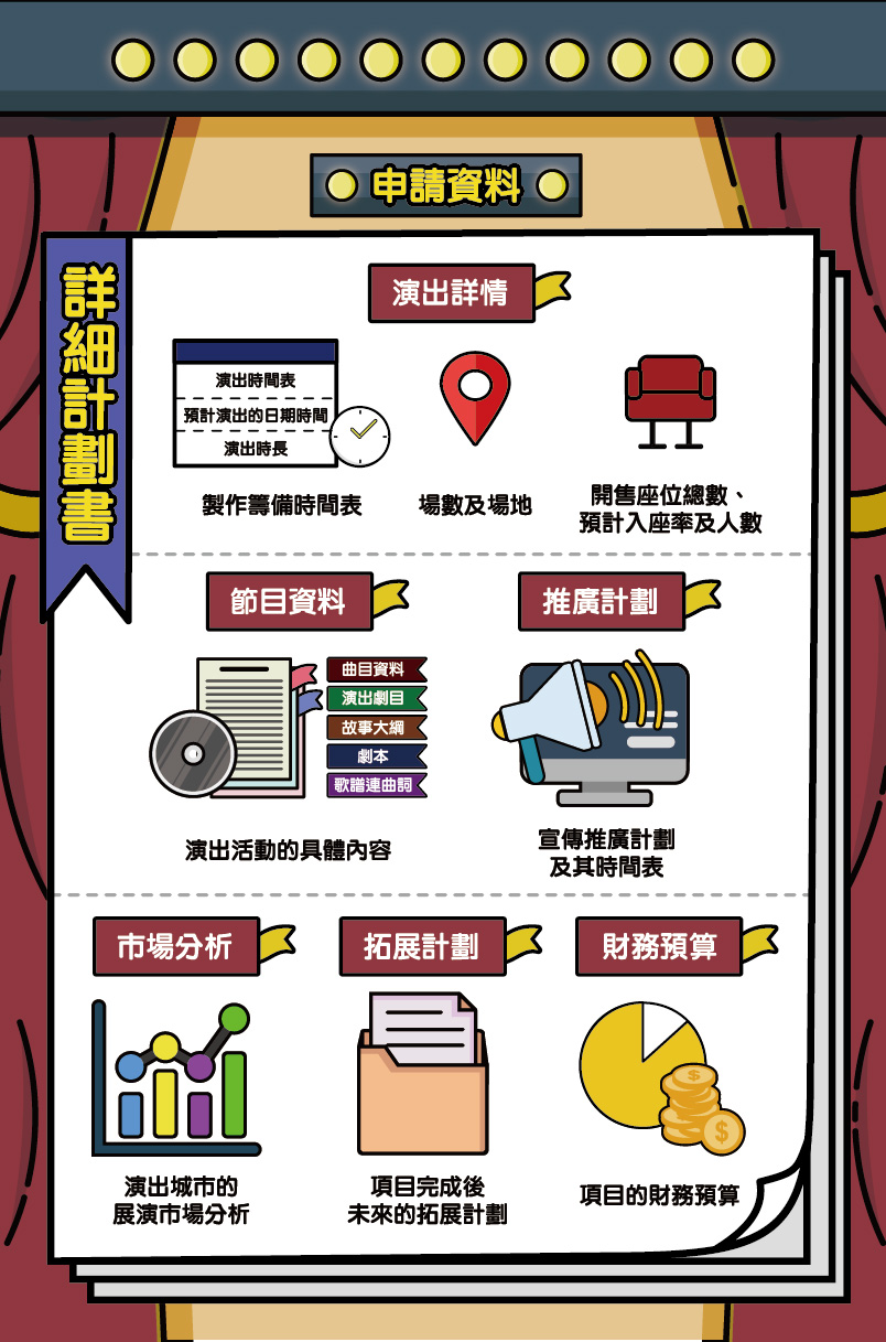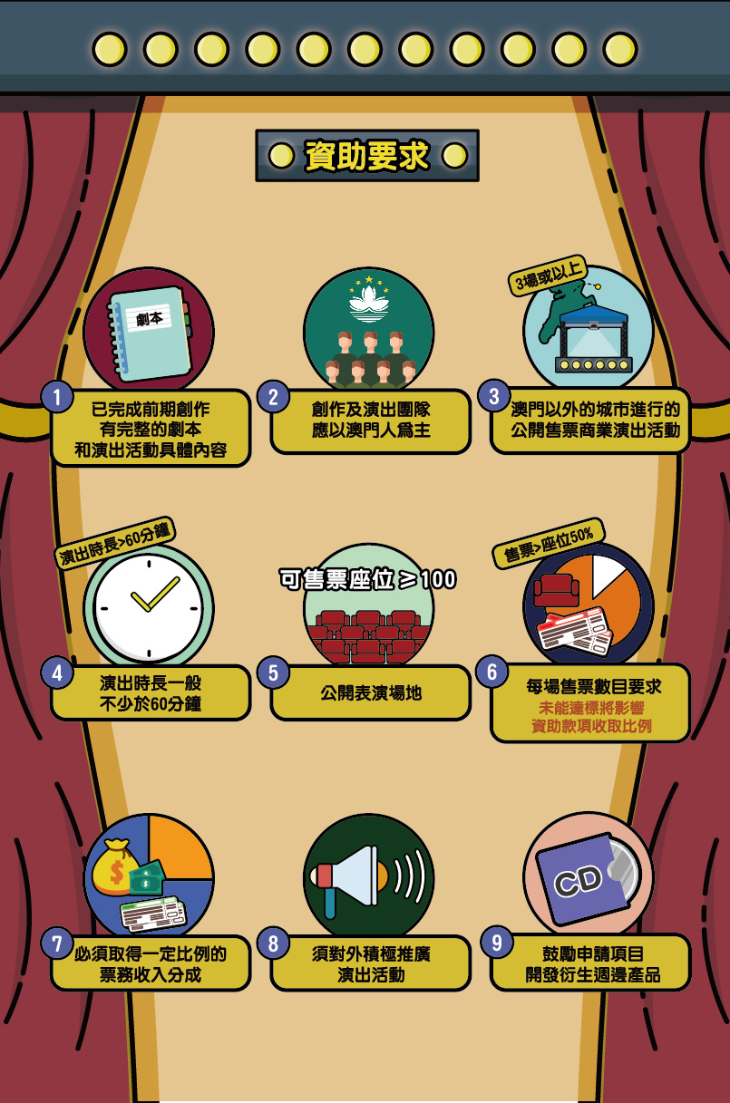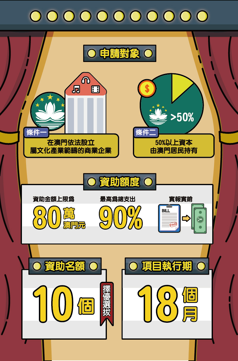 基金將擇優選拔申請項目;本期計劃資助名額10個,項目執行期18個月,資助額度為項目總支出的90%,上限為80萬澳門元。資助款項的應用範圍包括:創作、表演及技術人員的人事費用;展演場地租金;佈景、道具、服裝、燈光、音響等設備及裝卸舞台費用;推廣及宣傳費用;演職員交通費用(指定規格);衍生周邊產品費用;物流費用及核數師/會計師費用。基金以實報實銷形式對企業作出資助,資助款項須以封閉式專用帳戶管理,並經核數公司審核帳目,以確保公帑的有效運用。有意申請的企業可透基金過網頁(www.fic.gov.mo)下載申請表格,如有疑問,歡迎致電2850 1000或電郵info@fic.gov.mo查詢。