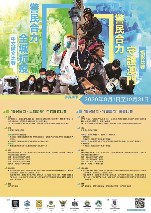 為持續推動警隊文化建設的工作,締結警民同心,並且在新型冠狀病毒疫情下,凝聚更多社會正能量,澳門保安部隊及保安部門今年繼續舉辦中文徵文及攝影比賽,本年度中文徵文比賽以“警民合力,全城抗疫”為主題,旨在展現在疫情當下,警察堅守崗位,與市民並肩抗疫,共同應對是次重大的突發公共衛生事件;而攝影比賽以“警民合力,守護澳門”為主題,呈現保安部隊及保安部門致力維護社會秩序,與民共同守護澳門平安。兩項比賽均於 2020 年 8 月 1 日至 10 月 31 日期間接受報名,歡迎廣大市民踴躍參與。