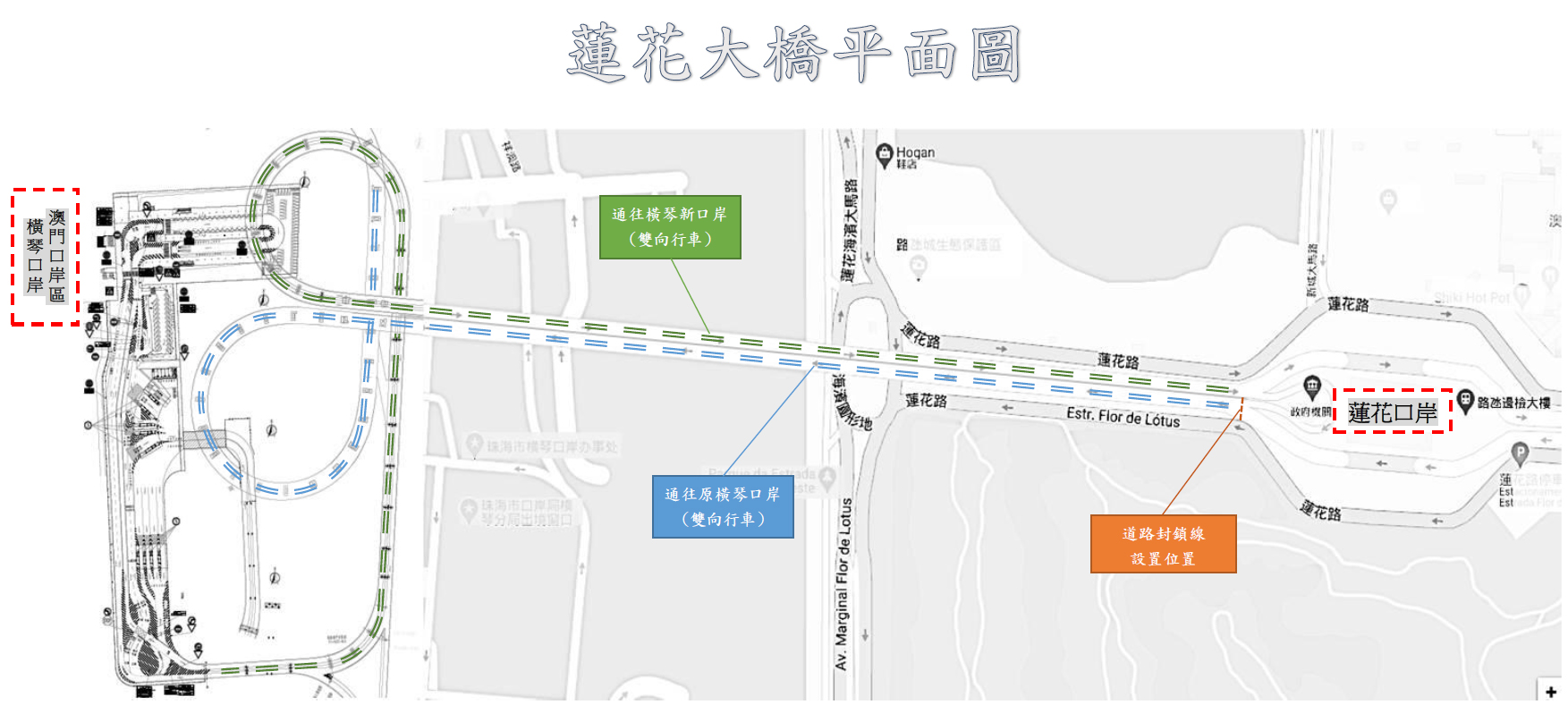 考慮到橫琴新口岸永久車道工程尚未完成,經珠澳兩地口岸部門協商後,決定口岸現階段只允許粵澳兩地牌車輛、橫琴單牌車輛及部分獲批准的貨車(危化品貨車)經臨時車道通關。為確保車道通關效率,除需要扶助者如殘障人士、孕婦、10歲或以下兒童、以及70歲或以上長者外,橫琴新口岸珠澳兩地的臨時出入境車道,暫不允許旅客隨車過關。由澳門前往珠海的載客車輛,必須先到位於口岸區二層的交通樞紐平台落客,方可駛往出境車道出境(見圖2)。