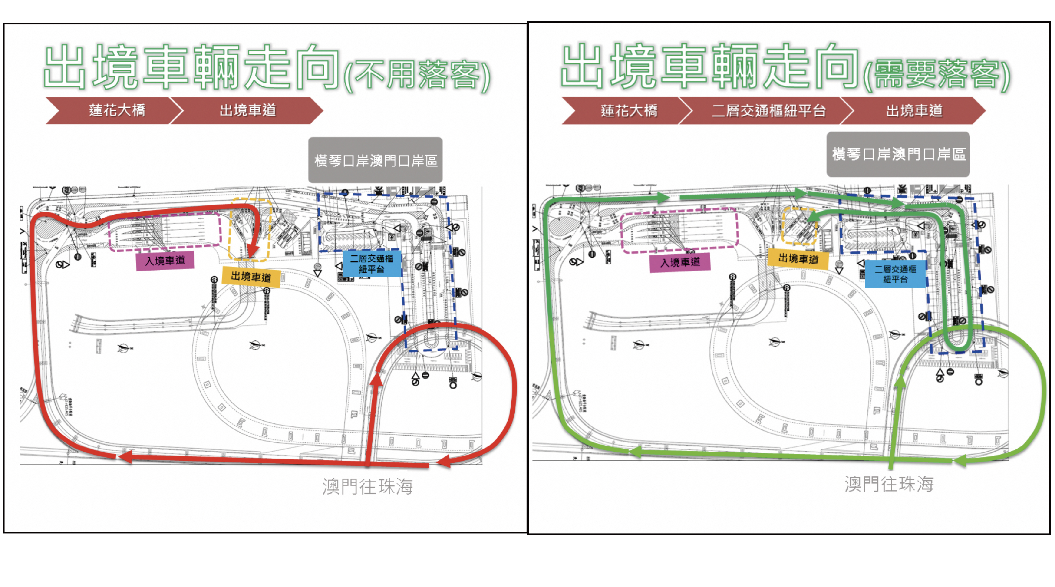 考慮到橫琴新口岸永久車道工程尚未完成,經珠澳兩地口岸部門協商後,決定口岸現階段只允許粵澳兩地牌車輛、橫琴單牌車輛及部分獲批准的貨車(危化品貨車)經臨時車道通關。為確保車道通關效率,除需要扶助者如殘障人士、孕婦、10歲或以下兒童、以及70歲或以上長者外,橫琴新口岸珠澳兩地的臨時出入境車道,暫不允許旅客隨車過關。由澳門前往珠海的載客車輛,必須先到位於口岸區二層的交通樞紐平台落客,方可駛往出境車道出境(見圖2)。