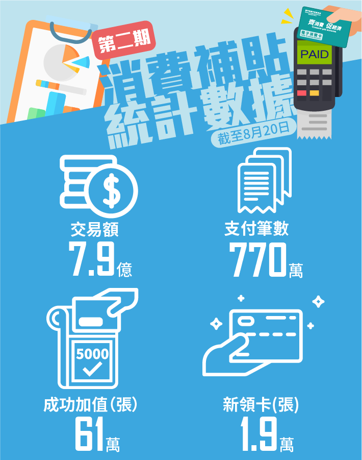 第二期消費卡於8月1日開始使用,截至8月20日,逾61萬張消費卡已完成加值,佔第一期已領卡數目(62.4萬張)的98%。連同逾1.9萬張新卡已被領取,逾63萬位居民已領取第二期消費卡。