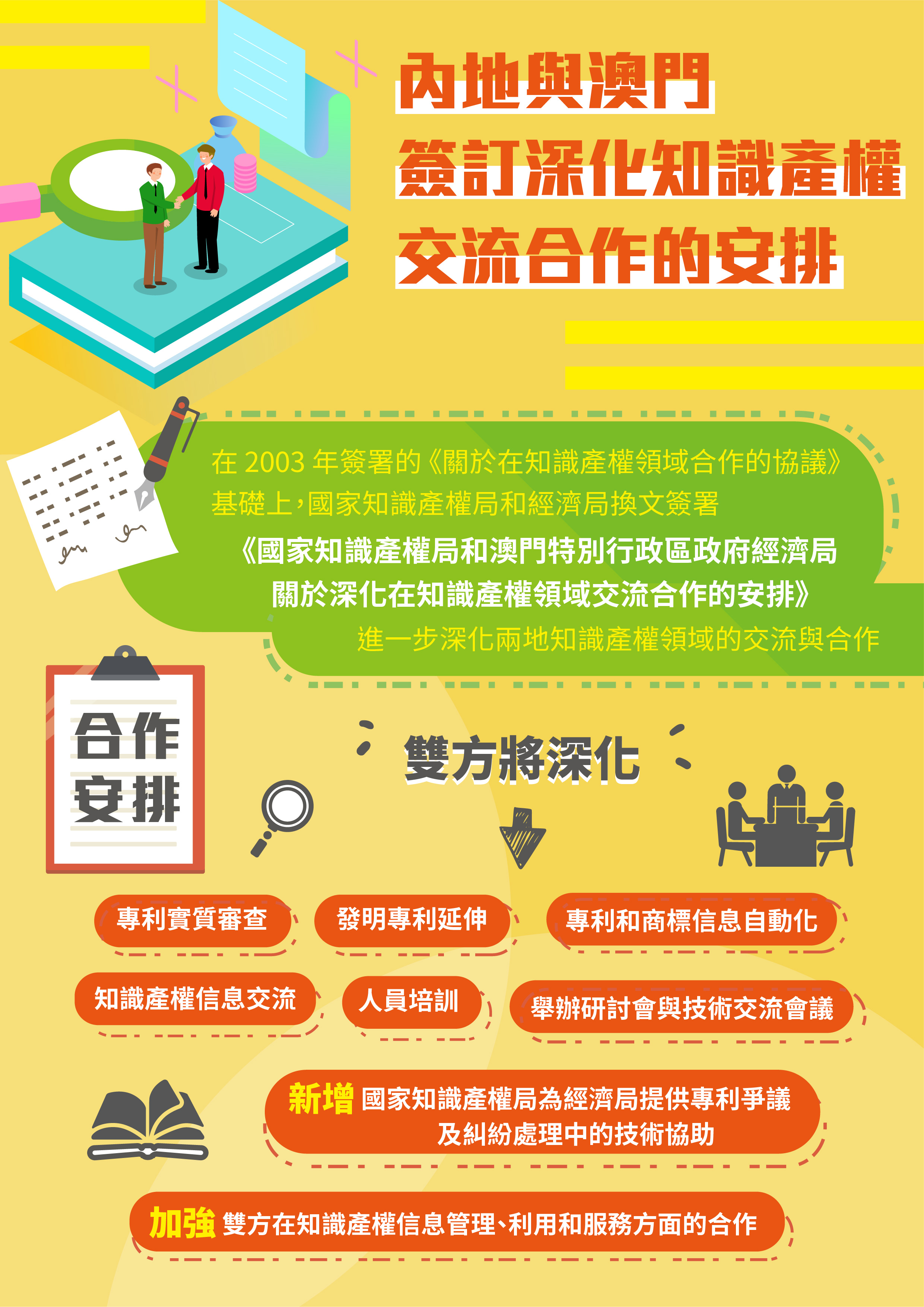 為進一步深化內地與澳門特區在知識產權領域的交流與合作,營造更加有利於創新和可持續發展的環境,國家知識產權局和經濟局在2003年簽署的《關於在知識產權領域合作的協議》基礎上,換文簽署《國家知識產權局和澳門特別行政區政府經濟局關於深化在知識產權領域交流合作的安排》。有關合作安排的內容已透過第25/2020號行政長官公告於2020年8月26日第35期第二組《澳門特別行政區公報》內刊登。