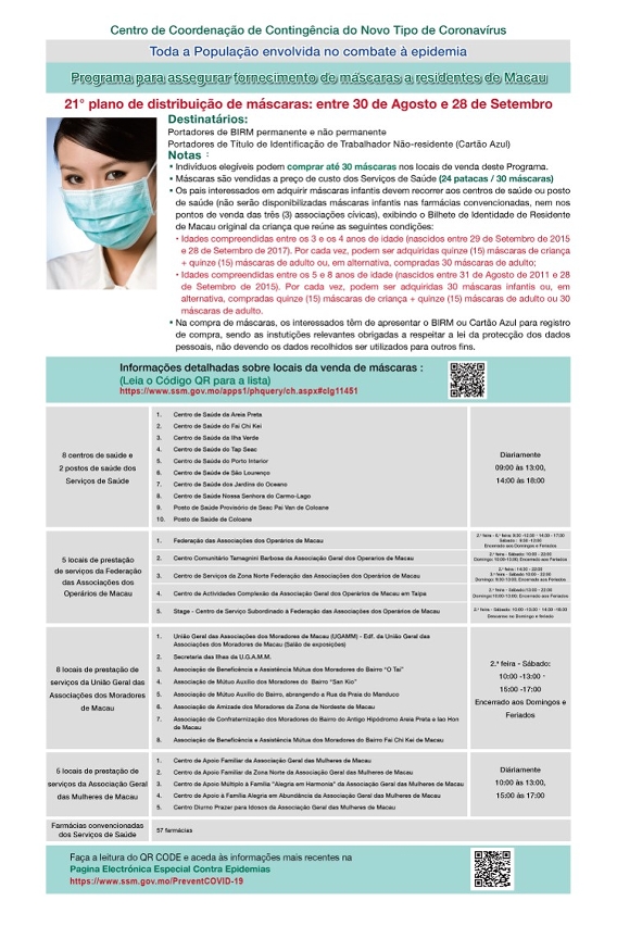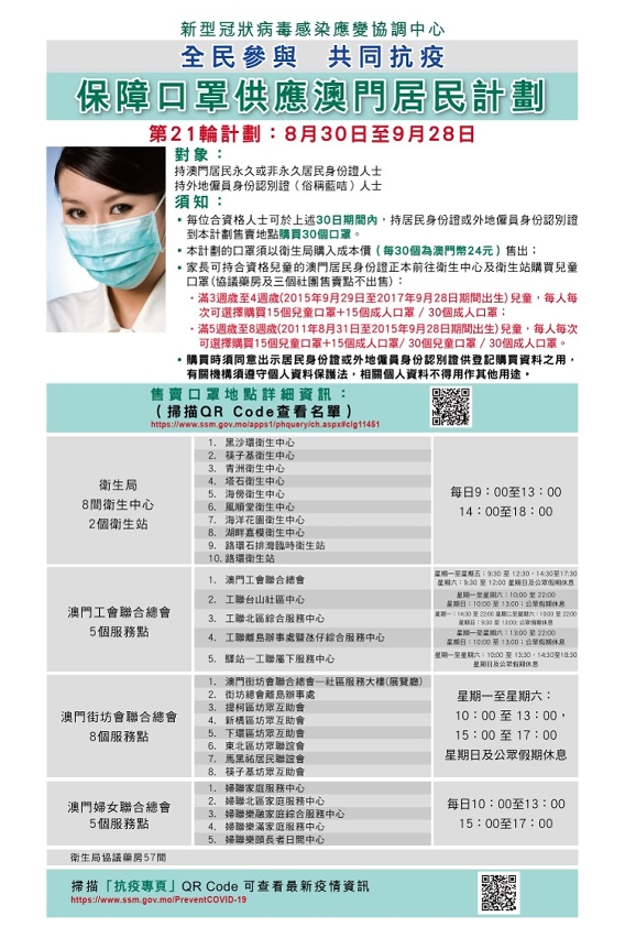 新型冠狀病毒感染應變協調中心公佈,第21輪保障口罩供應澳門居民計劃於周日(30日)日開始,售賣期間為30日,至到9月28日,期間每人可一次性購買30個口罩,售價共24澳門元。