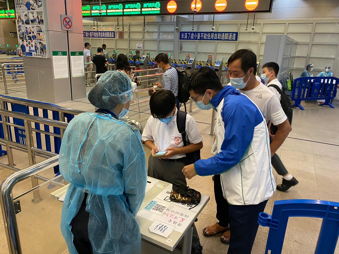教青局人員亦到出入境口岸瞭解跨境師生的通關情況,師生均提早到達口岸,並已預先做好“粵康碼"及“澳門健康碼”的轉換,兩地口岸更特別開啟學生專道以減省輪候時間,學生通關過程順利。另外,經與衛生局及內地衛生部門協調,新學年每周六會安排跨境師生於珠海指定的5間醫院進行免費核酸檢測。
