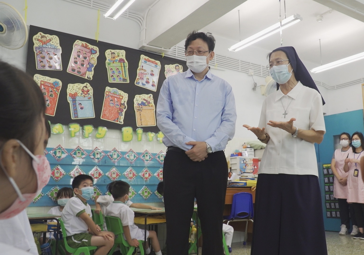 教青局領導、主管及人員於9月1日早上到學校實地瞭解學生上學及學校開學的情況,並向教職員工在疫情期間的辛勞付出和對特區政府各項防疫措施的積極配合表達謝意。有學生表示為較好掌握時間,選擇了步行上學或提早乘坐巴士,而學校亦安排教職員為進入校園的師生檢測體溫、檢查個人健康聲明、提醒師生用搓手液清潔雙手,進入校園後,亦要按序及保持距離進入課室,過程順暢。