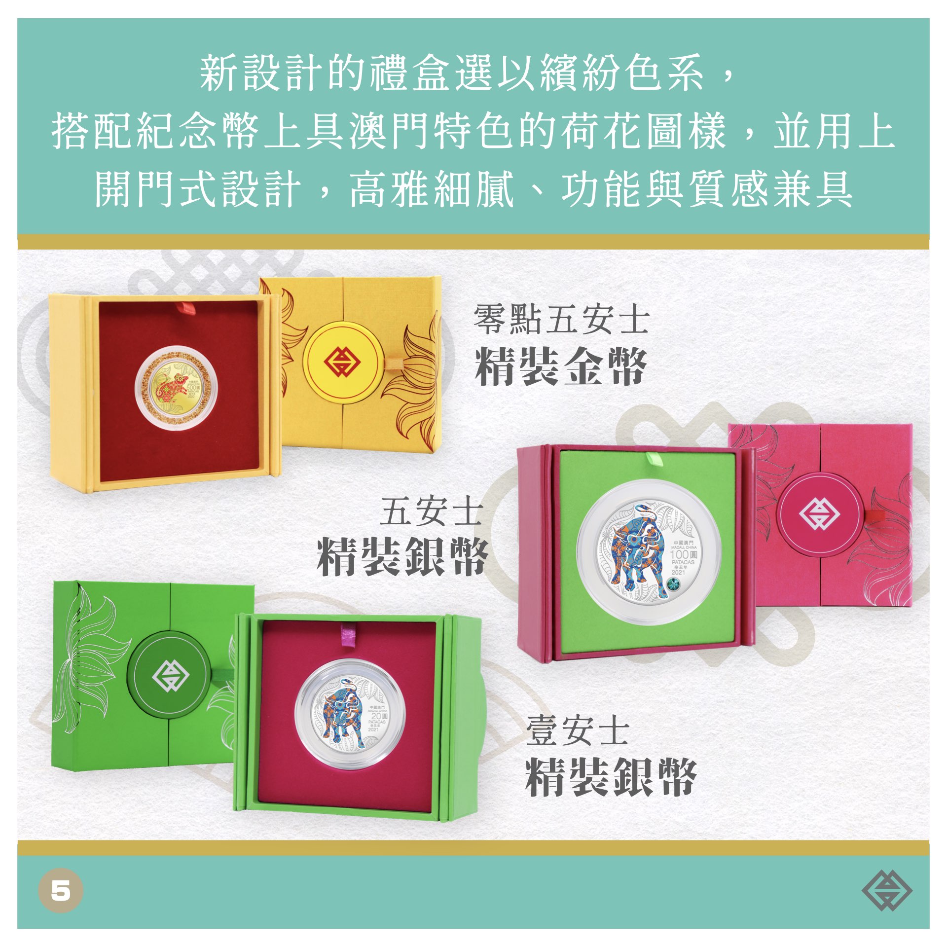 新一輪農曆生肖紀念幣採用全新設計,正面以色彩繽紛且具葡萄牙風格的圖案瓷磚構成農曆生肖圖案,背面則以嶄新高浮雕技術,從側面視覺立體地呈現澳門世界文化遺產景點。與上系列相近,是次發行的鼠年及牛年生肖紀念幣將包括壹安士及五安士精裝銀幣,而精裝金幣則由過往的零點二五安士加重至零點五安士,三款紀念幣的售價分別為1,380澳門元、8,800澳門元及16,800澳門元。