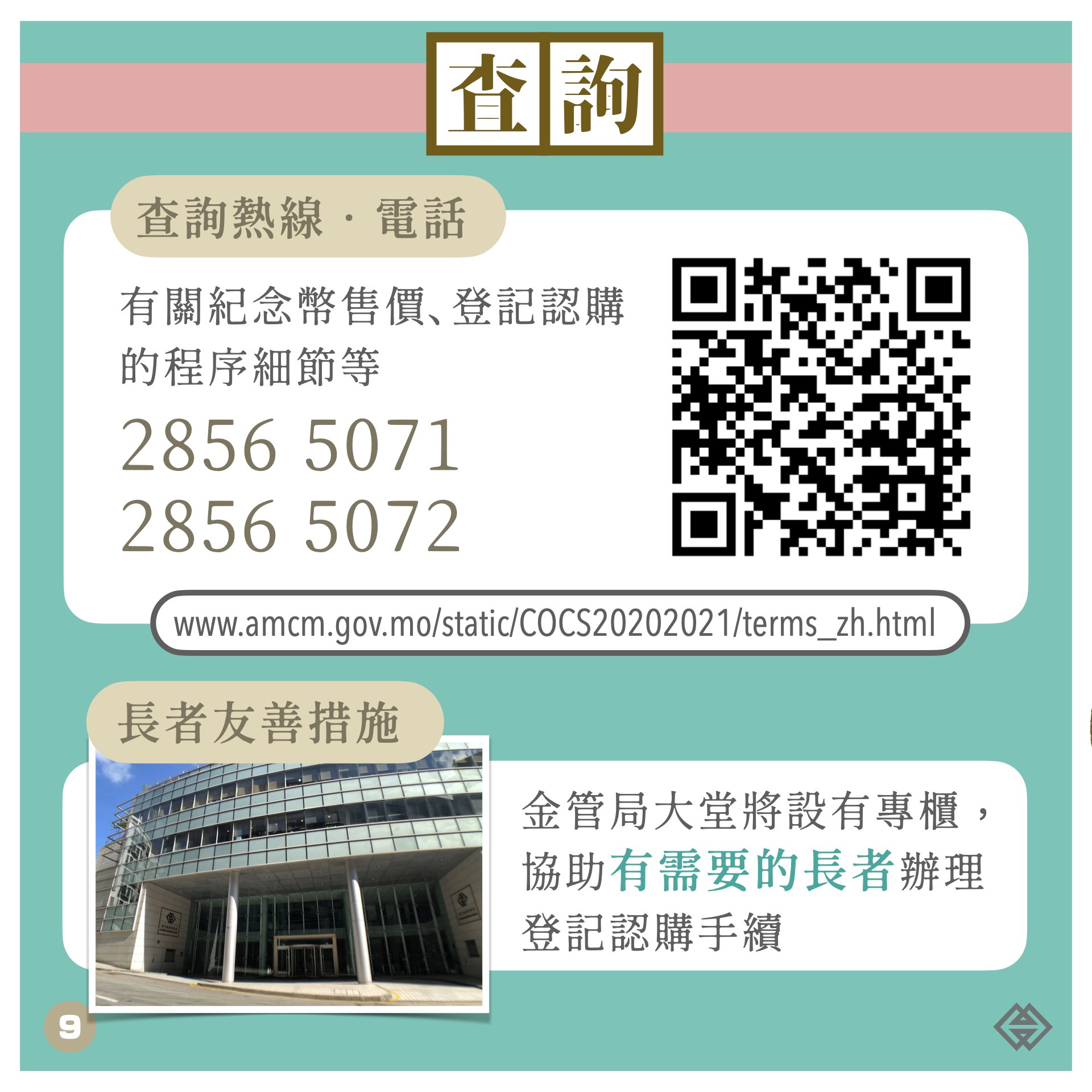 市民如欲了解紀念幣售價及登記認購的程序細節等,可瀏覽金管局網頁(https://www.amcm.gov.mo/static/COCS20202021/terms_zh.html),也可致電2856 5071或2856 5072查詢。
