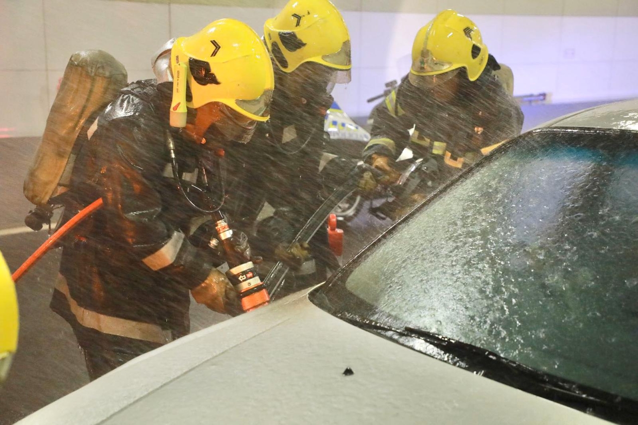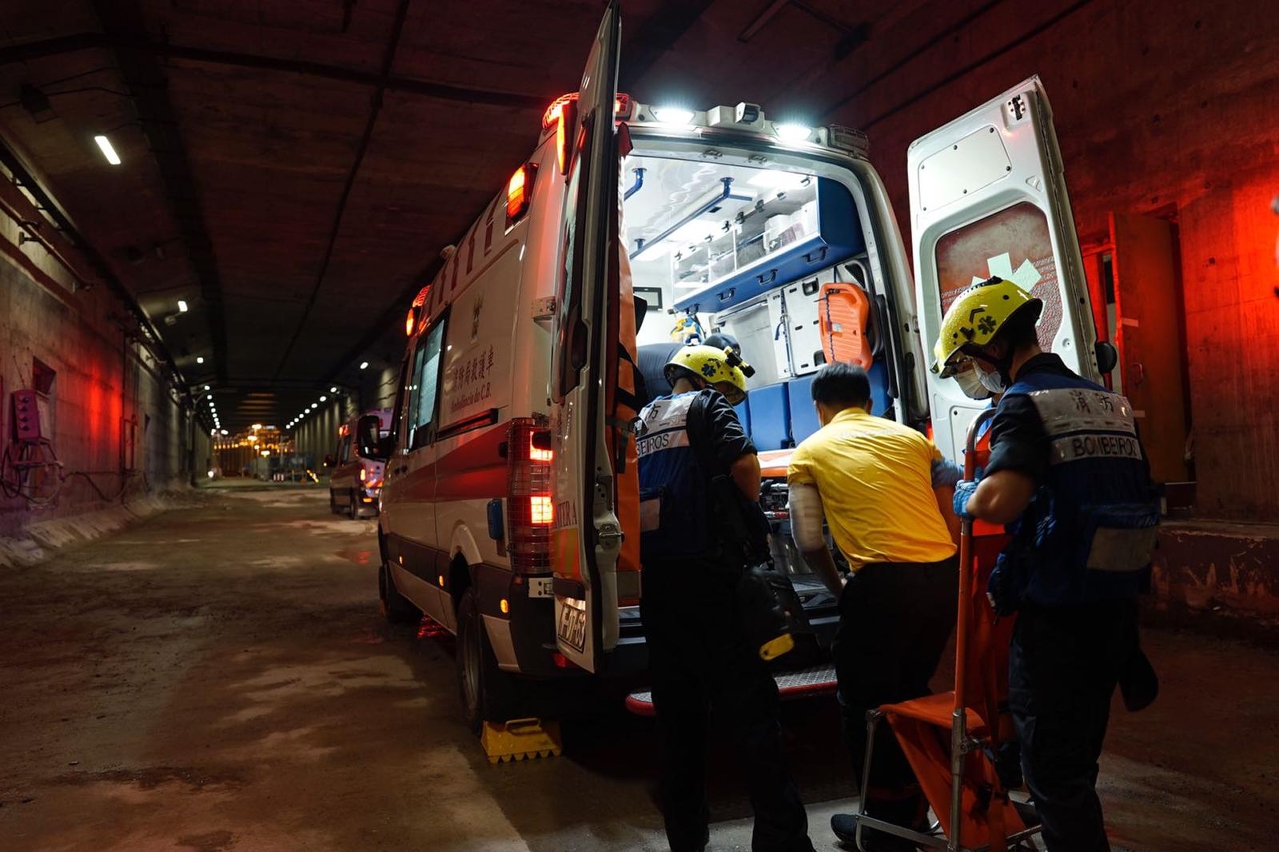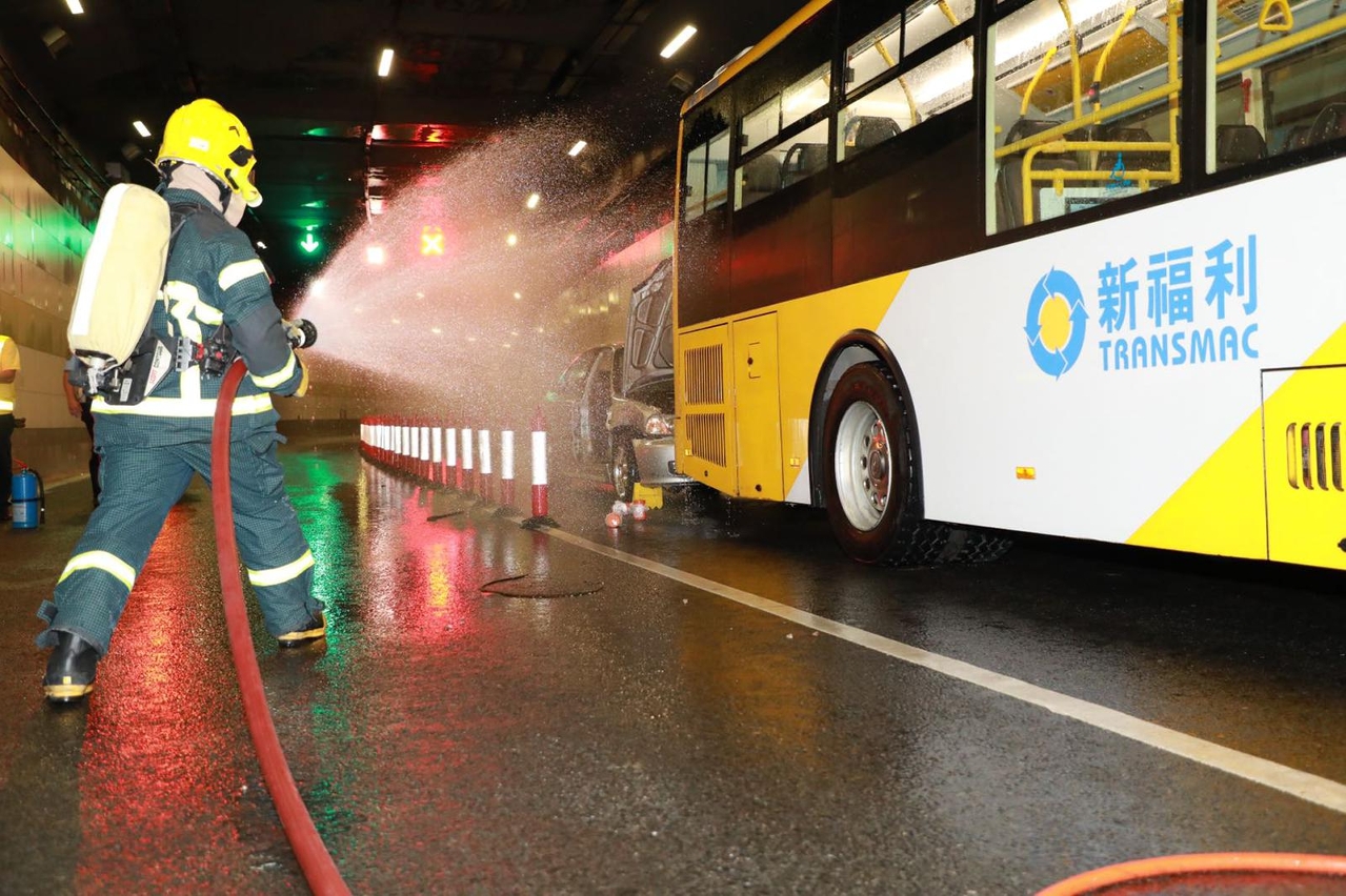 消防局接報後,立即按照相關預案調派救援車輛分別從實施單管雙向的行車管道及施工中的行車管道進入事故現場,同時河隧管理人員協調工程負責人,立即清空臨時封閉之行車管道內的行車線,以便本局的緊急救援車輛介入。到達現場後,消防員迅速展開滅火救援工作,期間成功為輕型汽車司機解困,並連同受傷的巴士司機送往醫院治理。
