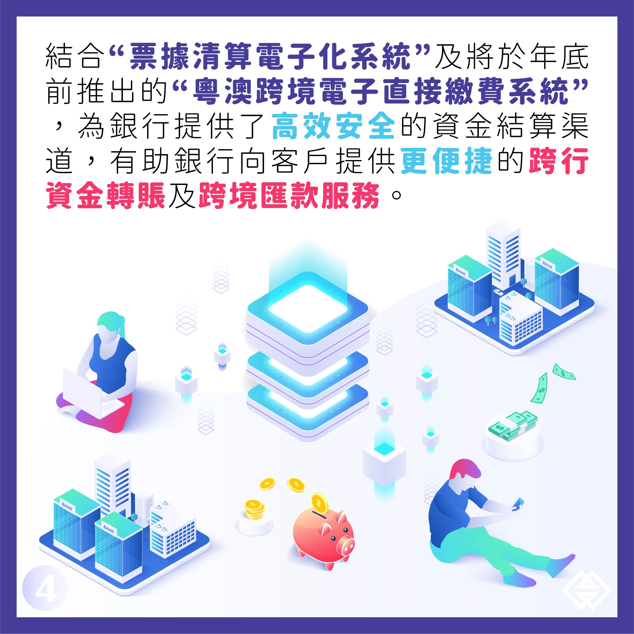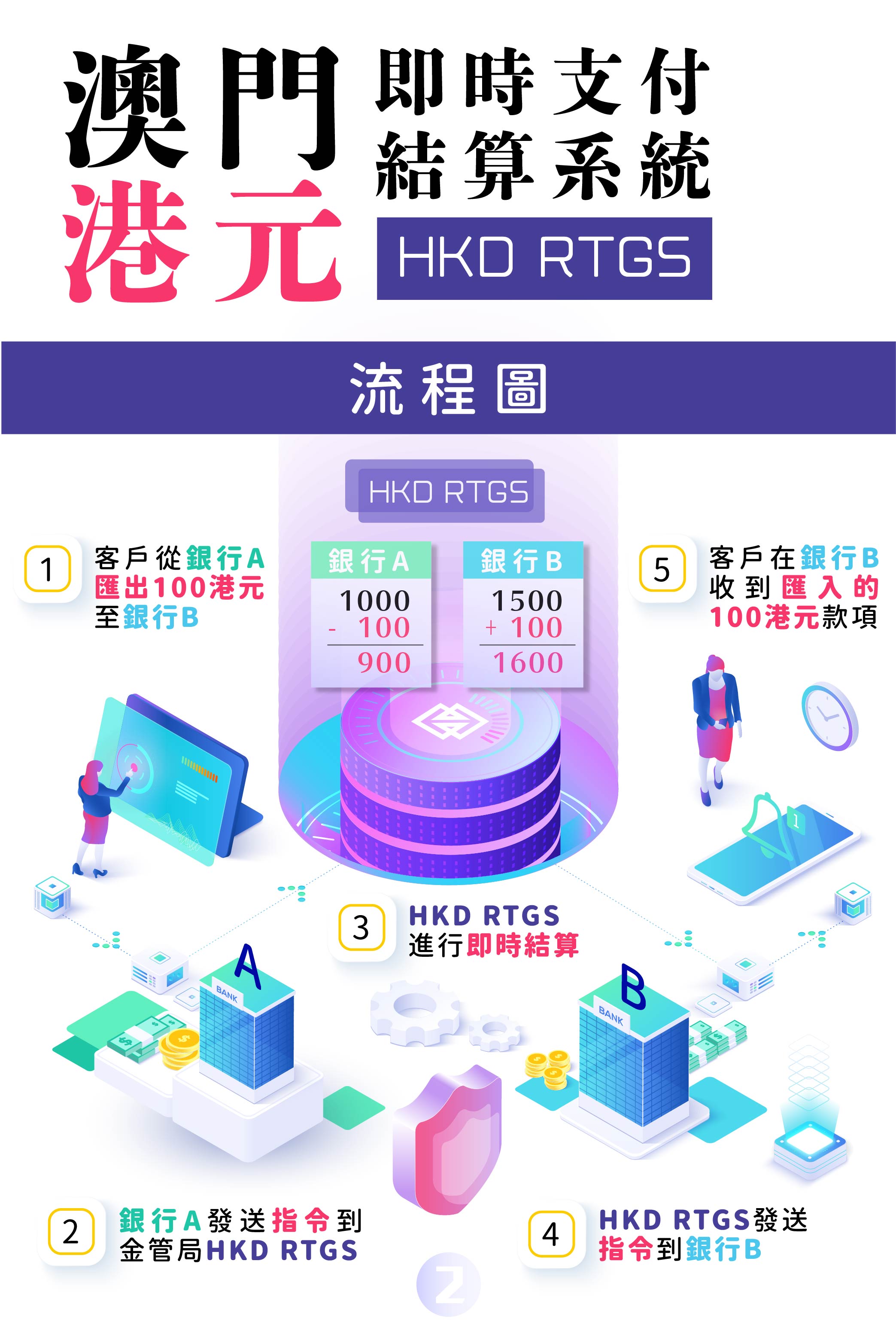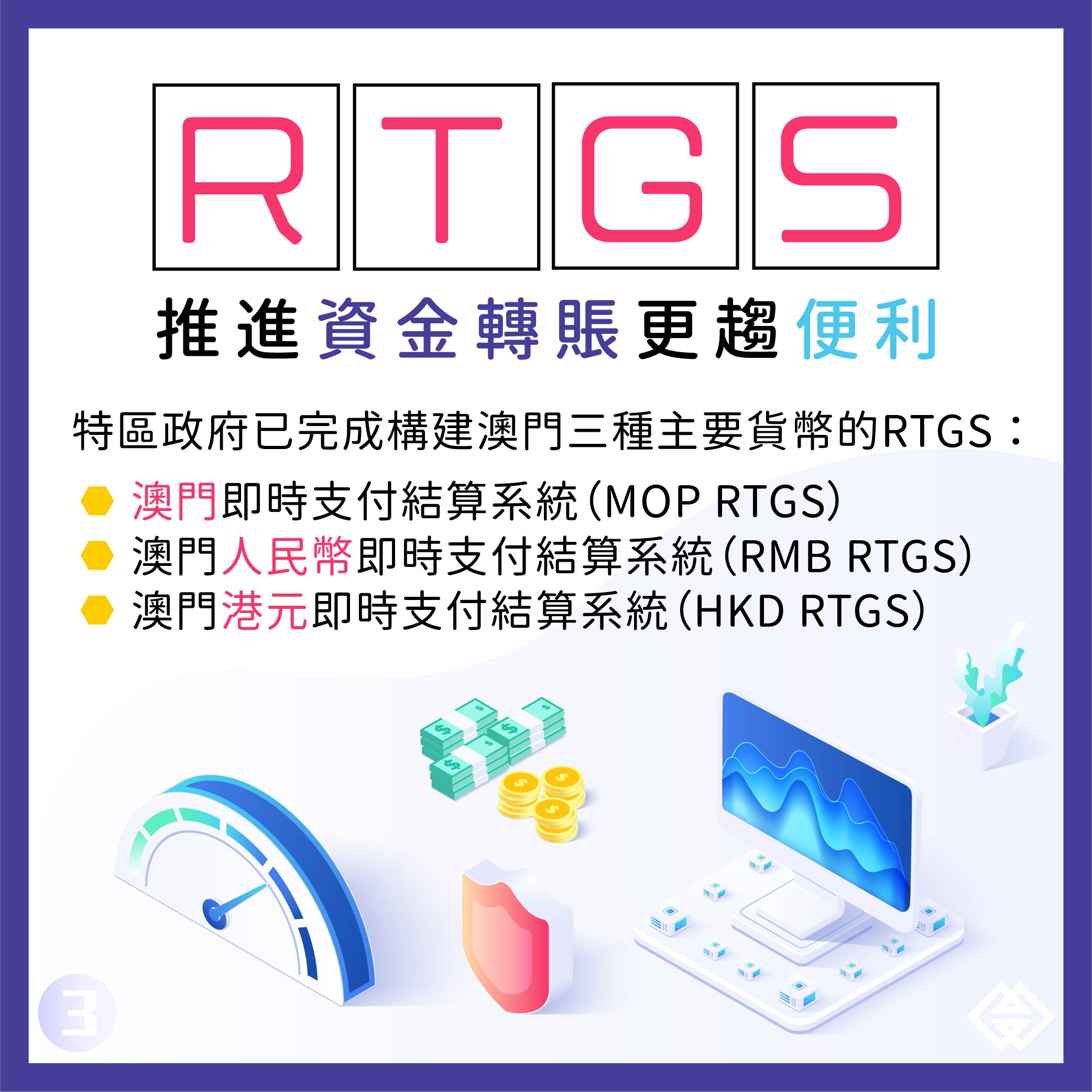 為推進資金轉賬更趨便利,特區政府近年已構建了“澳門即時支付結算系統(MOP RTGS)”、“澳門人民幣即時支付結算系統(RMB RTGS)”,連同現推出的HKD RTGS,已完成澳門主要使用的三種貨幣的RTGS。結合“票據清算電子化系統”及將於年底前推出的 “粵澳跨境電子直接繳費系統”,為銀行提供了高效安全的資金結算渠道,有助銀行向客戶提供更便捷的跨行資金轉賬及跨境匯款服務。