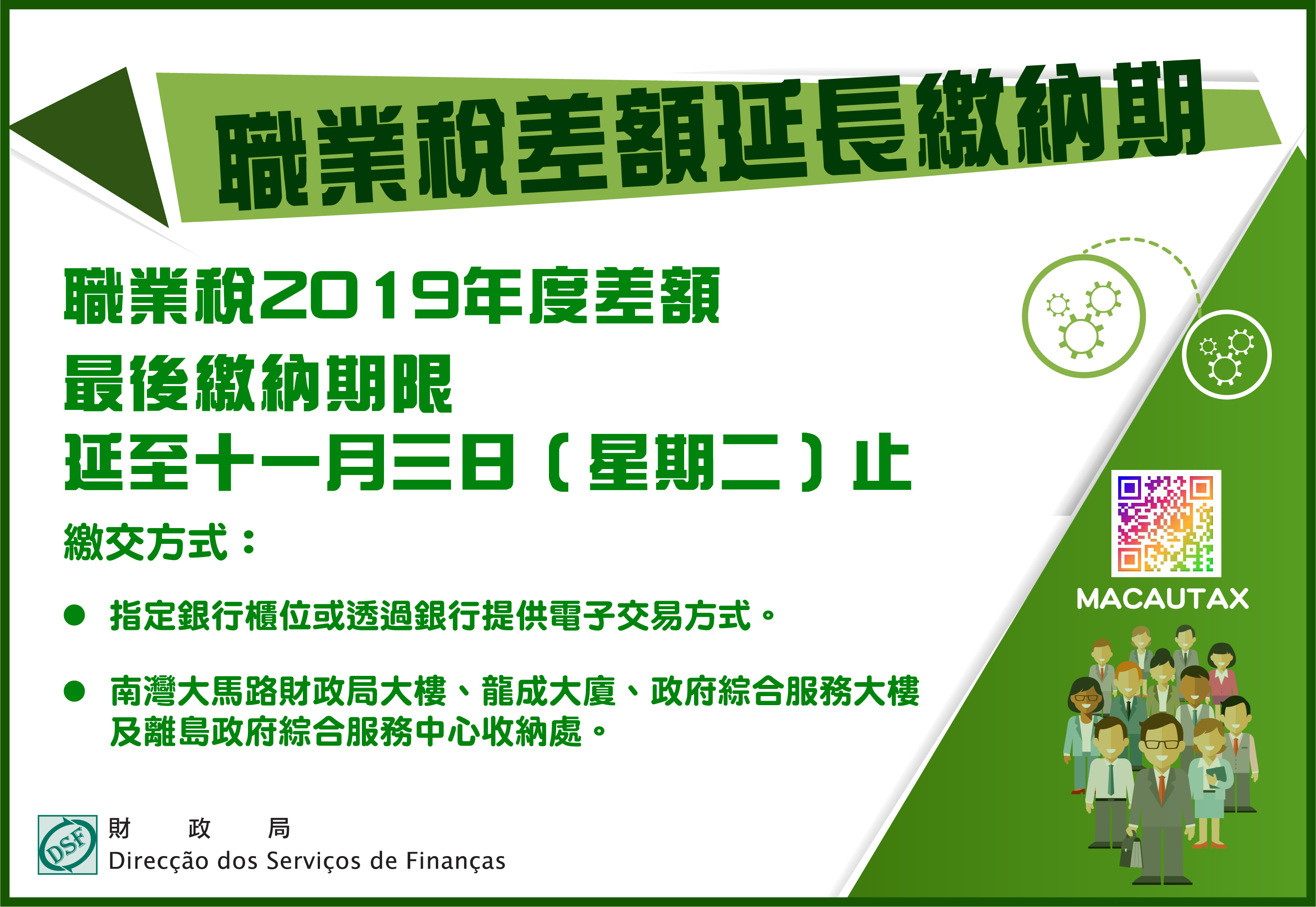 鑑於十月三十一日為星期六,職業稅2019年度差額之最後繳納期限延至十一月三日(星期二)止,為免增加輪候時間或因逾期繳納而附加之過期利息和罰款,財政局呼籲倘仍未繳納上述職業稅差額之納稅人,請儘快利用財政局提供的繳稅方式繳納,亦可於辦公時間內,到指定銀行櫃位或透過銀行提供電子交易方式,或位於南灣大馬路財政局大樓、龍成大廈、政府綜合服務大樓及離島政府綜合服務中心收納處繳交。