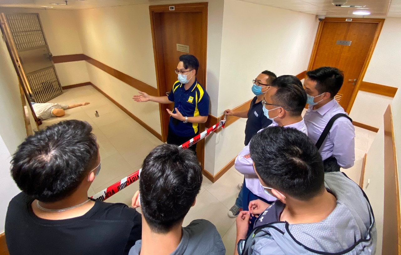 為加深學員對大廈管理防罪知識的理解和記憶,司警局人員特意設置了模擬案發現場,向他們講解正確應對罪案和保護案發現場的方法。此外,司警局人員還與學員就日常大廈管理工作中可能遇到的各種治安問題進行互動交流,逐一解答他們的疑問,冀能幫助他們更好地管理和維護大廈的治安環境,警民合力防範罪案發生。