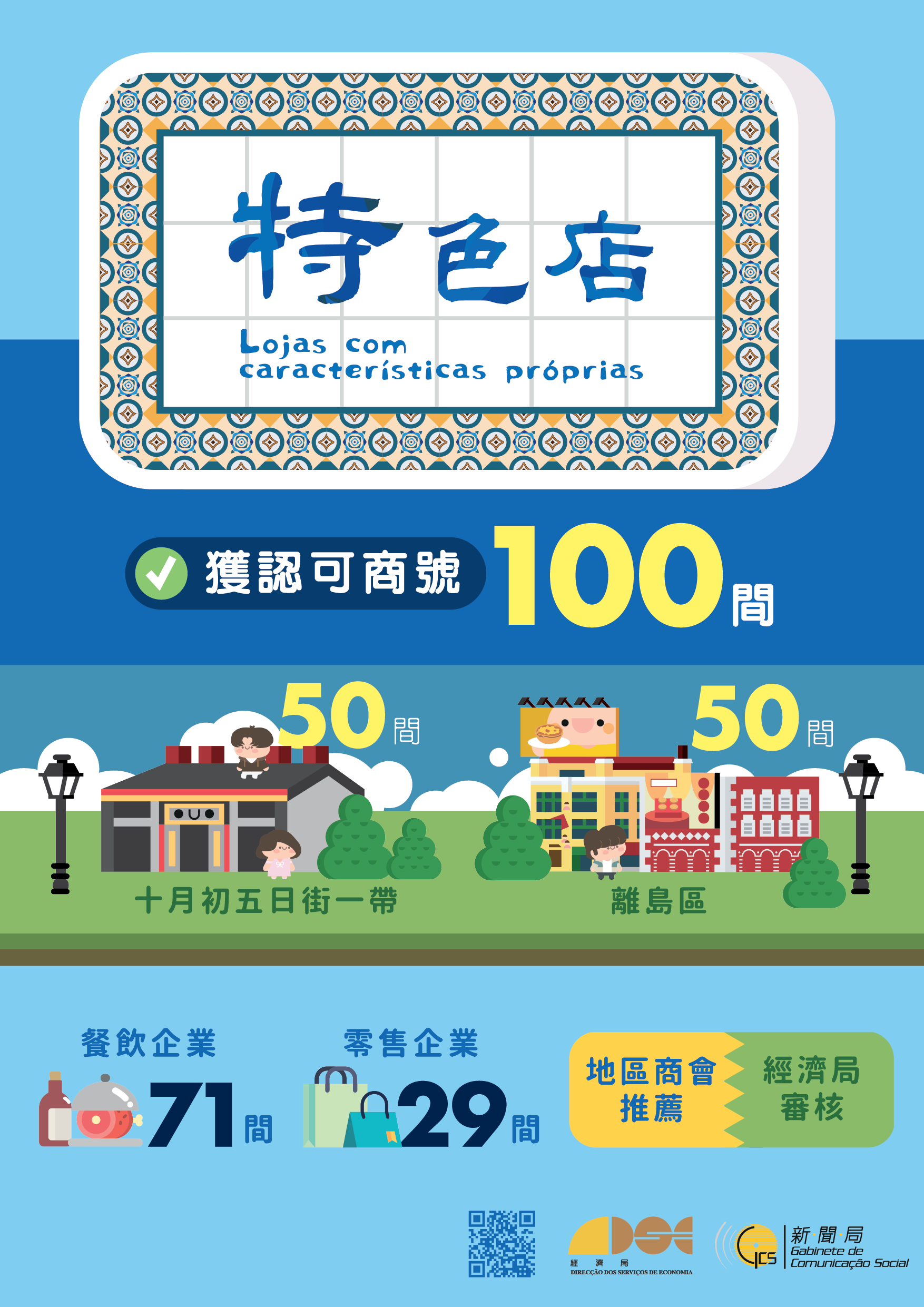為做好經濟復甦的準備,經濟局於7月初啟動“特色店計劃”,與地區商會合作,以先導方式扶助具特色的餐飲及零售業,推動企業提高整體服務水平和品牌形象,首階段於十月初五日街一帶試行,第二階段擴展至離島區,現時獲認可的特色店商戶共有100間,包括餐飲企業71間及零售企業29間。