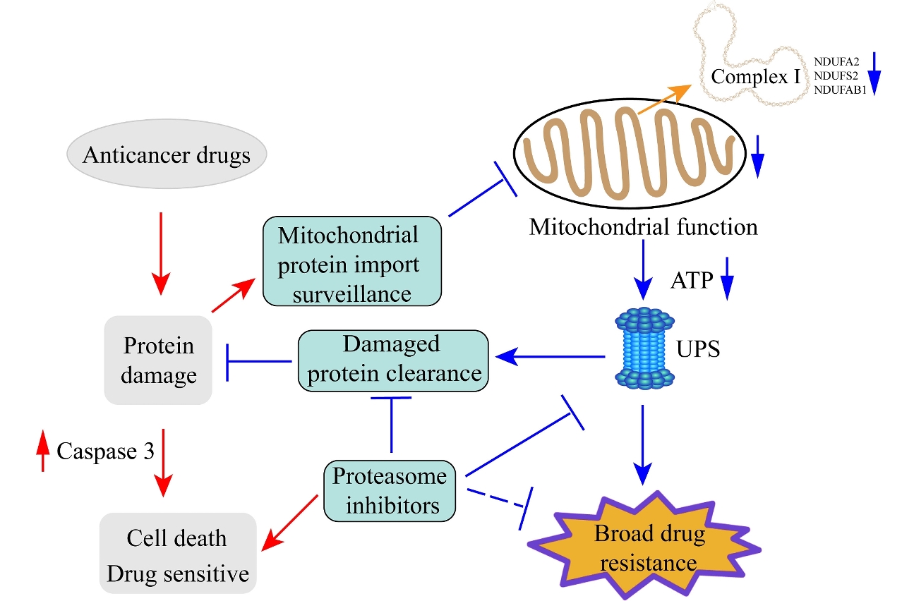 癌症死亡率一直居高不下的重要原因是因為人體會自動對藥物產生耐藥性,當癌細胞同時或依次用幾種藥物治療時,它們可能會變成多藥耐藥性,致使這類癌症非常難以治療,例如腫瘤細胞原發性耐藥、獲得性耐藥等。許多腫瘤即使在化療處理初期效果很好,但是細胞會逐漸獲得耐藥性而得不到控制。此外,許多癌症在經一種藥物治療後,往往演變成對其它許多未接觸過而且結構不同、作用機制各異的藥物也產生交叉耐藥性,即廣譜耐藥性,令許多尖端醫療機構束手無措。研究小組通過全基因組RNAi篩選和進化耐藥模型,發現增強的蛋白酶體活性和較低的線粒體活性促進了順鉑耐藥性。順鉑是目前臨床應用最廣泛的化療藥物之一,用以治療各種不同類型的癌症。進一步的研究表明,順鉑治療可引起蛋白質損傷,從而觸發線粒體蛋白質輸入監測通路的啟動。線粒體蛋白輸入監測通路的啟動一方面導致線粒體活性的降低,另一方面能夠啟動蛋白酶體活性,從而增加受損蛋白的清除率並拯救細胞活力。另外,研究團隊通過比對69種藥物文庫的篩選和患者類器官的篩選,證實增強的蛋白水解作用和較低的線粒體活性是耐受多達40種抗癌藥物的共同機制,而蛋白酶體抑制劑治療逆轉了對其中27種藥物的耐受性。研究成果進一步顯示,通過納米顆粒包備的順鉑和硼替佐米可以進一步增強了抗腫瘤的功效,並減輕了藥物聯合治療引起的副作用。