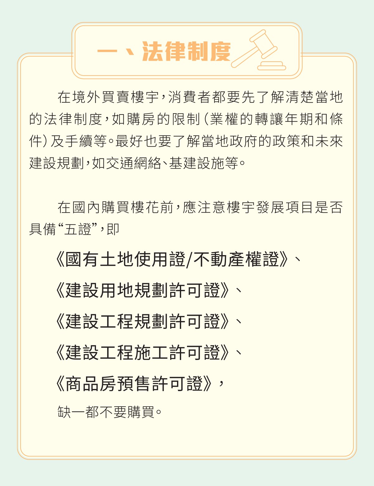 如屬內地樓宇廣告,廣告內亦應以清晰可見的方式載有“五證”即“國有土地使用證/不動產權證”、“建設用地規劃許可證”、“建設工程規劃許可證”、“建設工程施工許可證”及 “商品房預售許可證”的編號以及“廣告法”第17條(關於樓宇廣告)的規定所要求的資訊。
