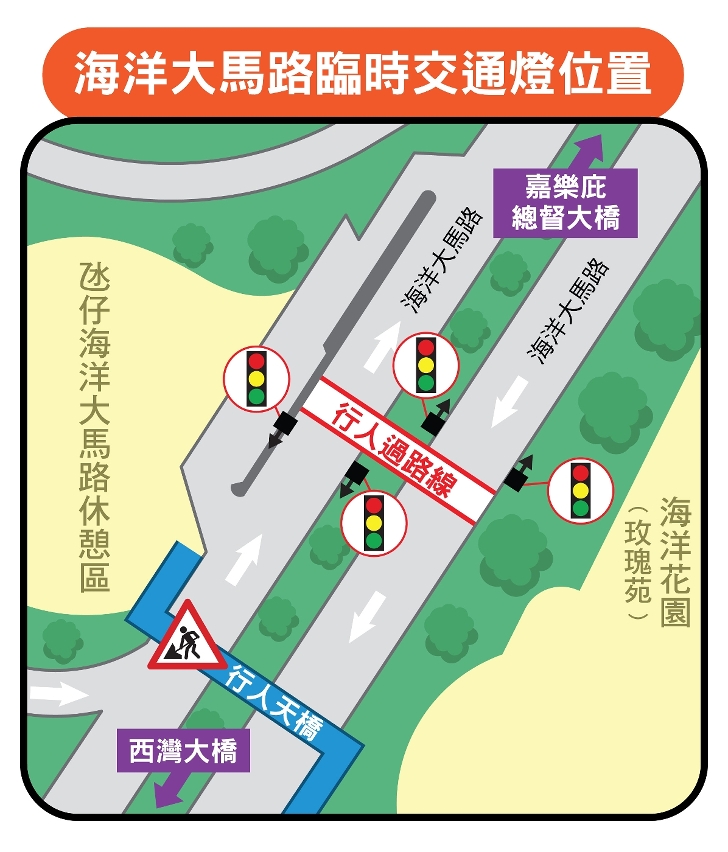 因維修海洋大馬路近海濱廣場之行人天橋及鋪設下水道過街工程,市政署於1月23日(周六)起,在海洋大馬路近海洋花園(玫瑰苑),距離行人天橋約50米位置將設置臨時交通燈及行人過路線,相關工期約2個月。市政署及交通事務局呼籲駕駛者留意現場指示及交通燈號,小心駕駛。