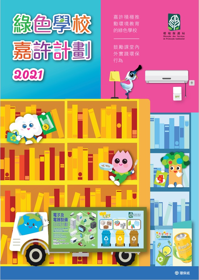 2021“綠色學校嘉許計劃”設有“綠色學校白金獎”、“綠色學校榮譽大獎”及“綠色學校傑出表現獎”,表揚綠色學校持續對澳門環境教育工作的貢獻。今年的主題為“減廢節能齊響應 珍惜食物共行動”,學校可參與計劃內之“環保教案設計獎勵計劃”及“環保校園嘉Fun獎”,設計及實踐一系列環保教育活動,從而營造校園的環保氛圍。