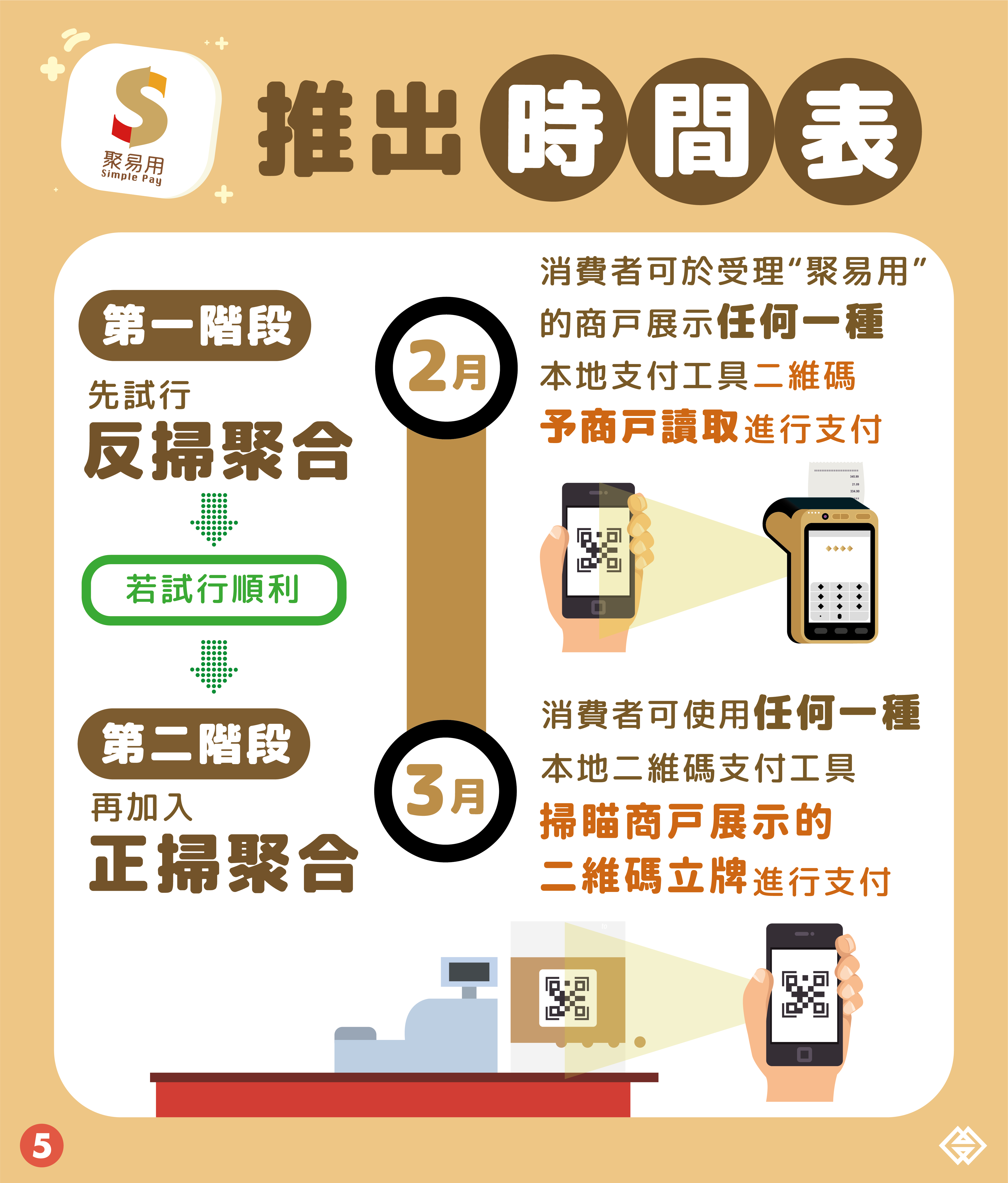 “聚易用”的首階段“反掃聚合”將於2月8日推出試行,市面上將陸續出現受理“聚易用”的商戶,屆時,消費者可於貼有“聚易用”標誌的商店,選擇任何一種本地二維碼支付工具進行交易。