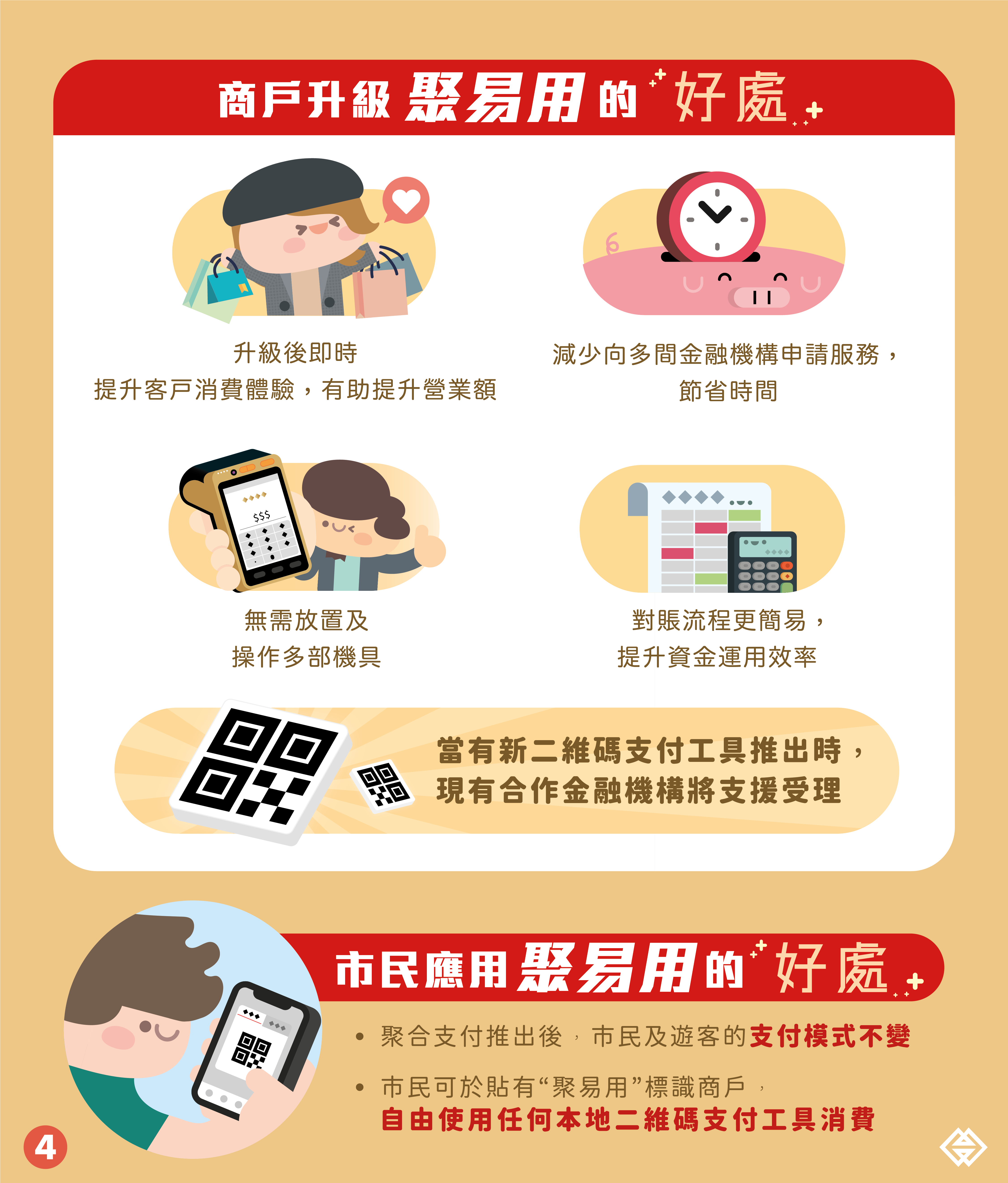 “聚易用”首階段為“反掃聚合”,市民於受理“聚易用”的商戶,展示任何一種本地二維碼支付工具,予商戶機具讀取,便可完成交易。下一階段為“正掃聚合”,即市民可使用任何一種本地二維碼支付工具,掃瞄商戶展示的二維碼立牌進行支付。“聚易用”一方面有助提升市民的支付體驗,同時解決商戶需放置及操作多部機具的問題,以及簡化商戶與銀行及支付機構的對賬流程和商戶資金管理等工作。