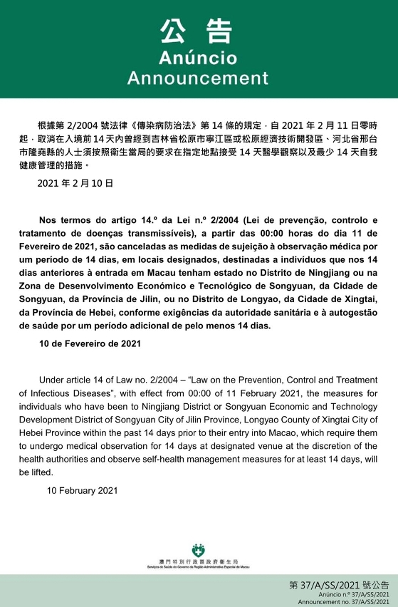 新型冠狀病毒感染應變協調中心宣佈,因應吉林省及河北省的疫情變化,根據第2/2004號法律《傳染病防治法》第14條的規定,自2021年2月11日零時起,取消在入境前14天內曾經到過吉林省松原市寧江區或松原經濟技術開發區、河北省邢台市隆堯縣的人士須按照衛生當局的要求在指定地點接受14天醫學觀察以及最少14天自我健康管理的措施。