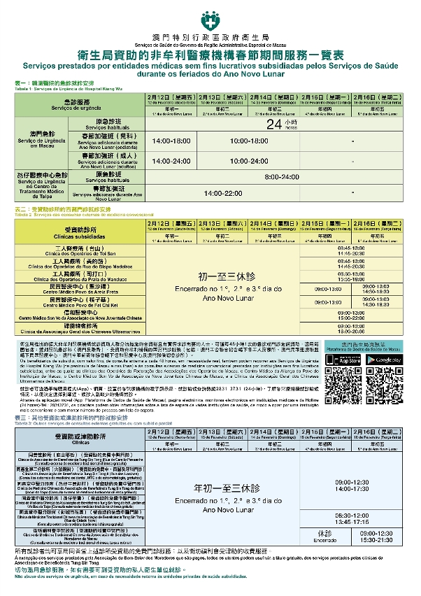 本年2月12日至14日(星期五至星期日)為農曆初一至初三,是澳門特區公眾假期,2月15日(星期一)及2月16日(星期二)為農曆初四及初五,是公共行政工作人員的補假,政府部門休息,為方便有需要人士就診,衛生局將維持相關醫療服務,為此作出如下服務安排: