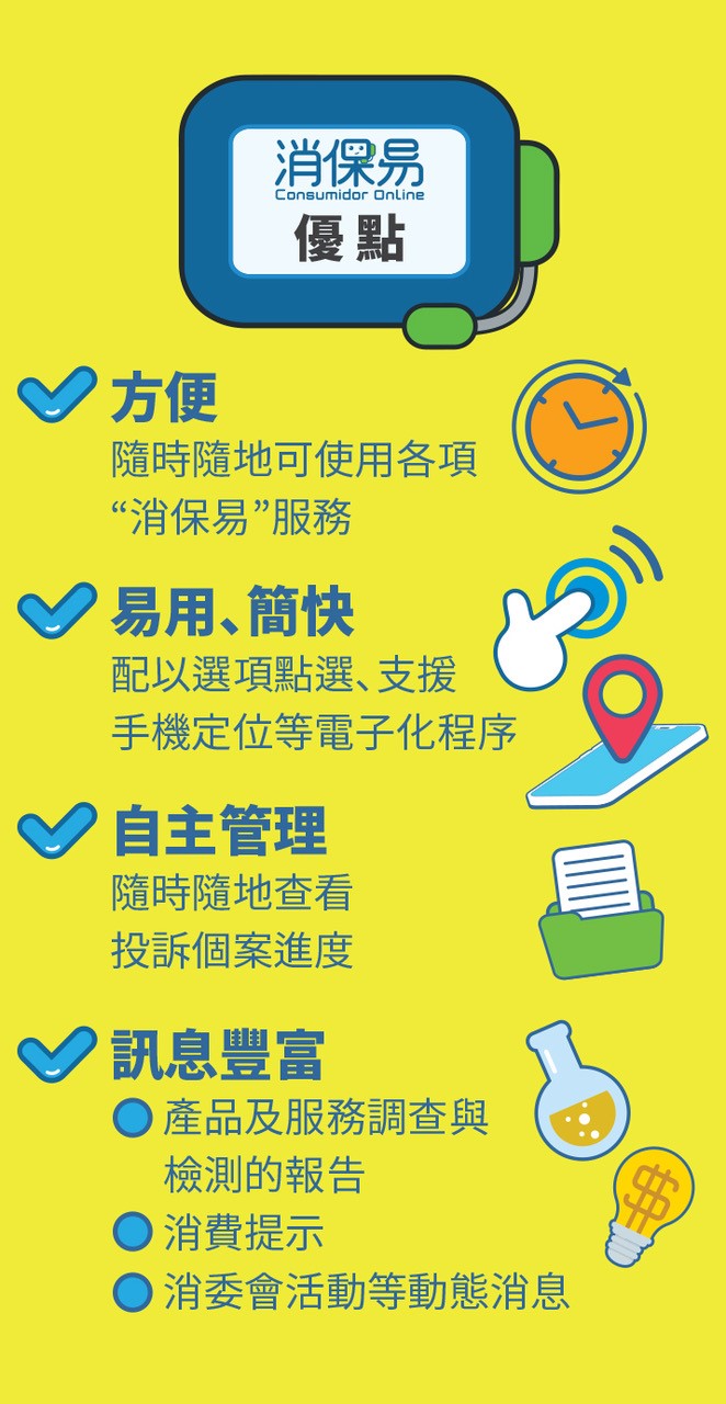 消費者委員會“消保易”具有便民、簡易及高效等優點,消費者可以利用該平台進行網上投訴、反映意見及查詢個案的進度。